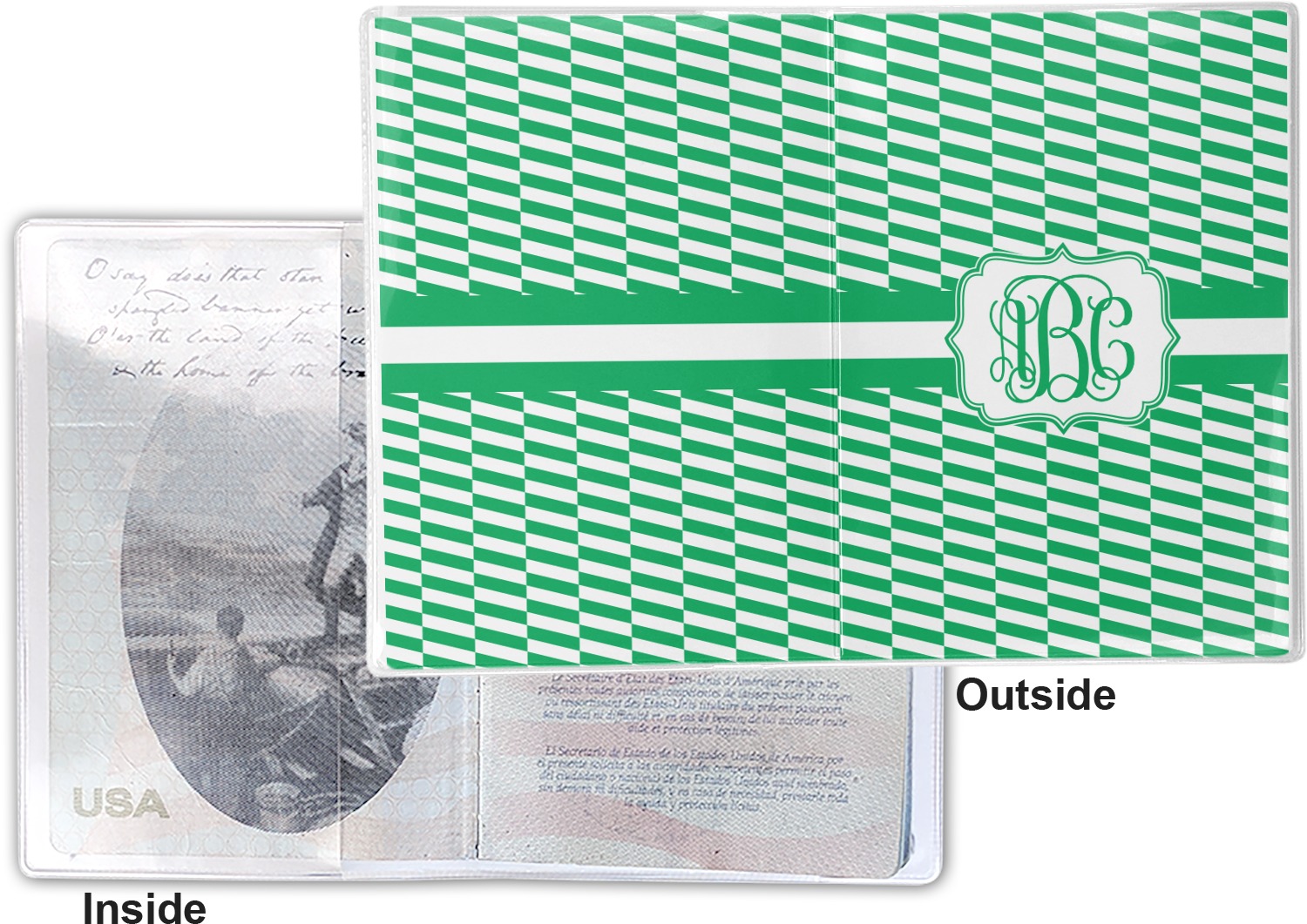 This cover is made of a sturdy clear vinyl with a personalized vinyl insert inside. There is a large and a small pocket on either side to hold the covers of your passport easily and firmly. The passport holder is approximately 7.5" x 5.25", the perfect size to snugly fit your passport. This slim cover is the perfect way to protect your passport without being one more bulky item you have to carry.