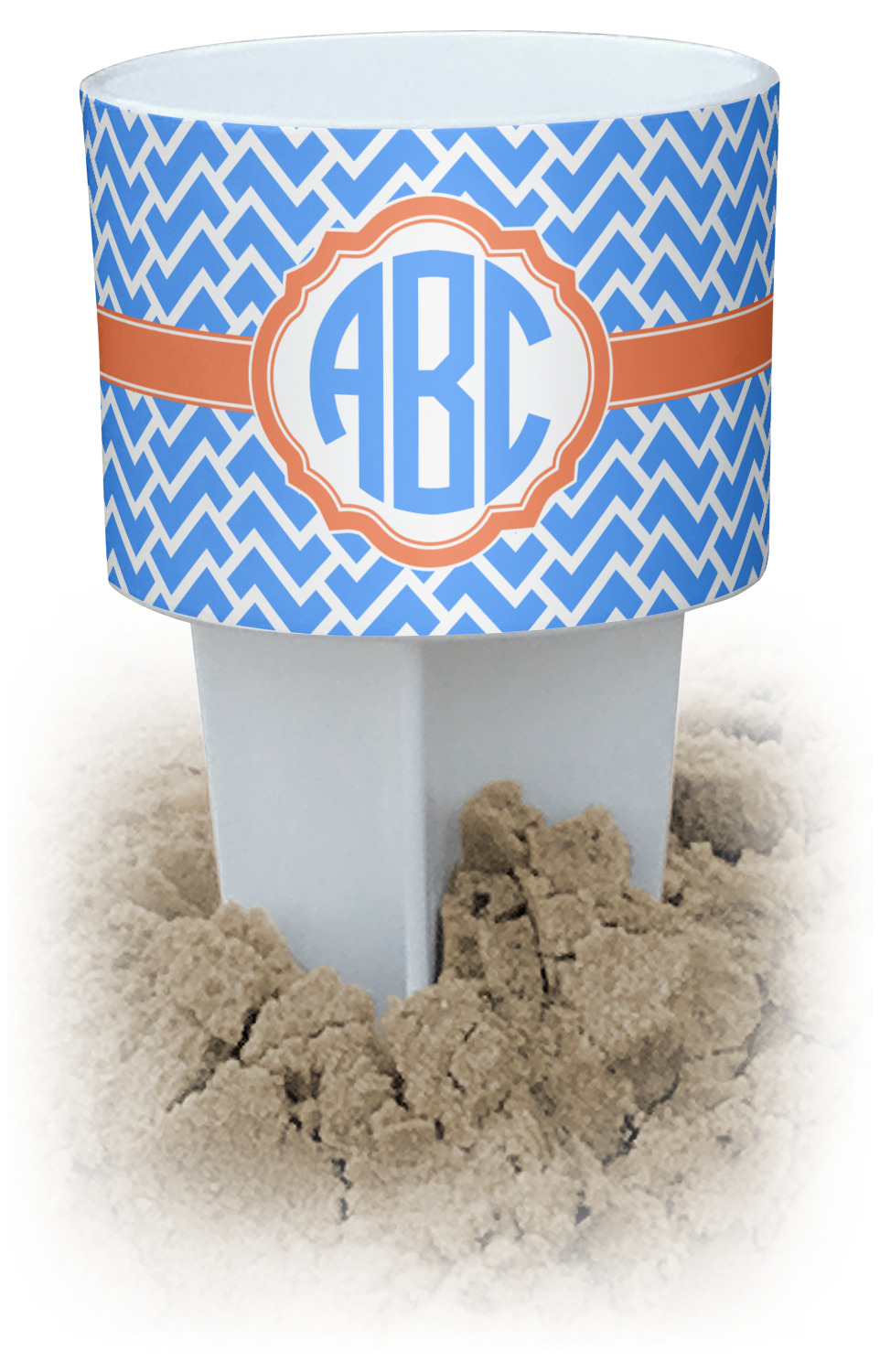 This cup holder has a large stake at its bottom that anchors it to the sand or ground below, while the cup holder rests above the stake. The entire drink holder is made of durable plastic and displays your customization around the cup holder portion. We sell these personalized beach spikers in two different colors: black and white.