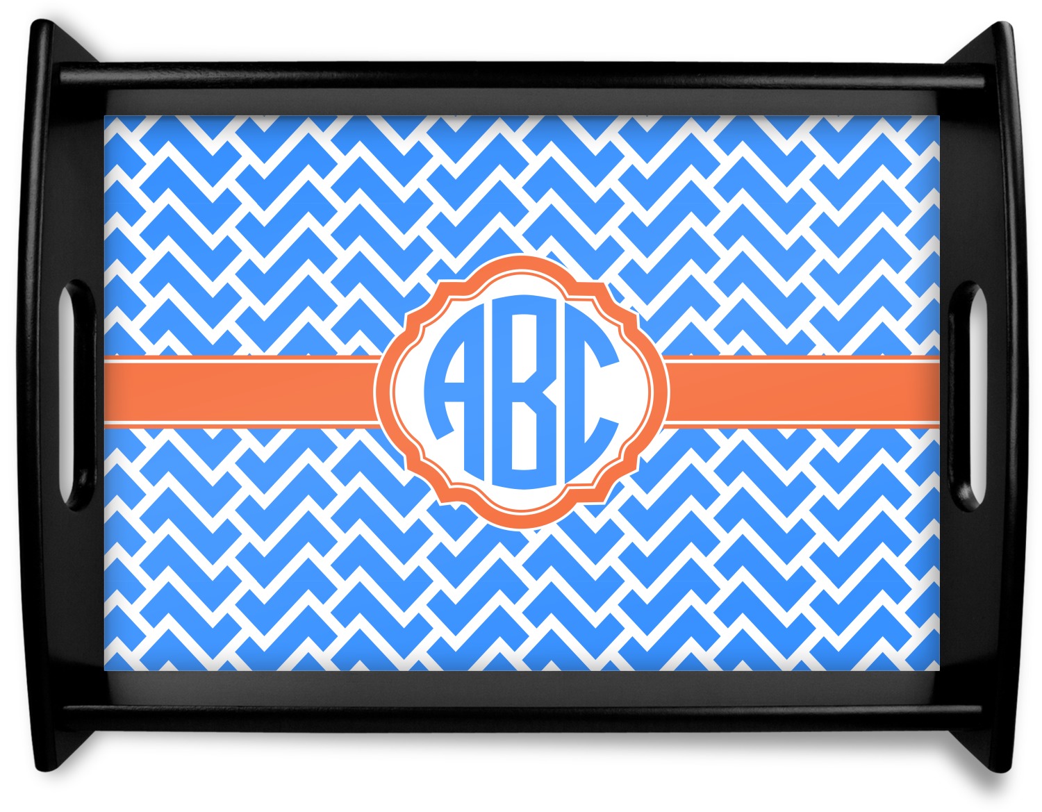 This serving tray with handles features square edges and two rounded sides, creating a very modern look. Each side is fabricated from a beautifully cut, natural wood. The bottom of the interior of the tray displays your customized design in bright, vibrant color. The tray is sold in both a black color and a natural wood look. Each variation of the wood serving tray has two sizes: Small, which is 14" x 10" x 2.25", and Large, which is 19.5" x 13.5" x 2.75".
