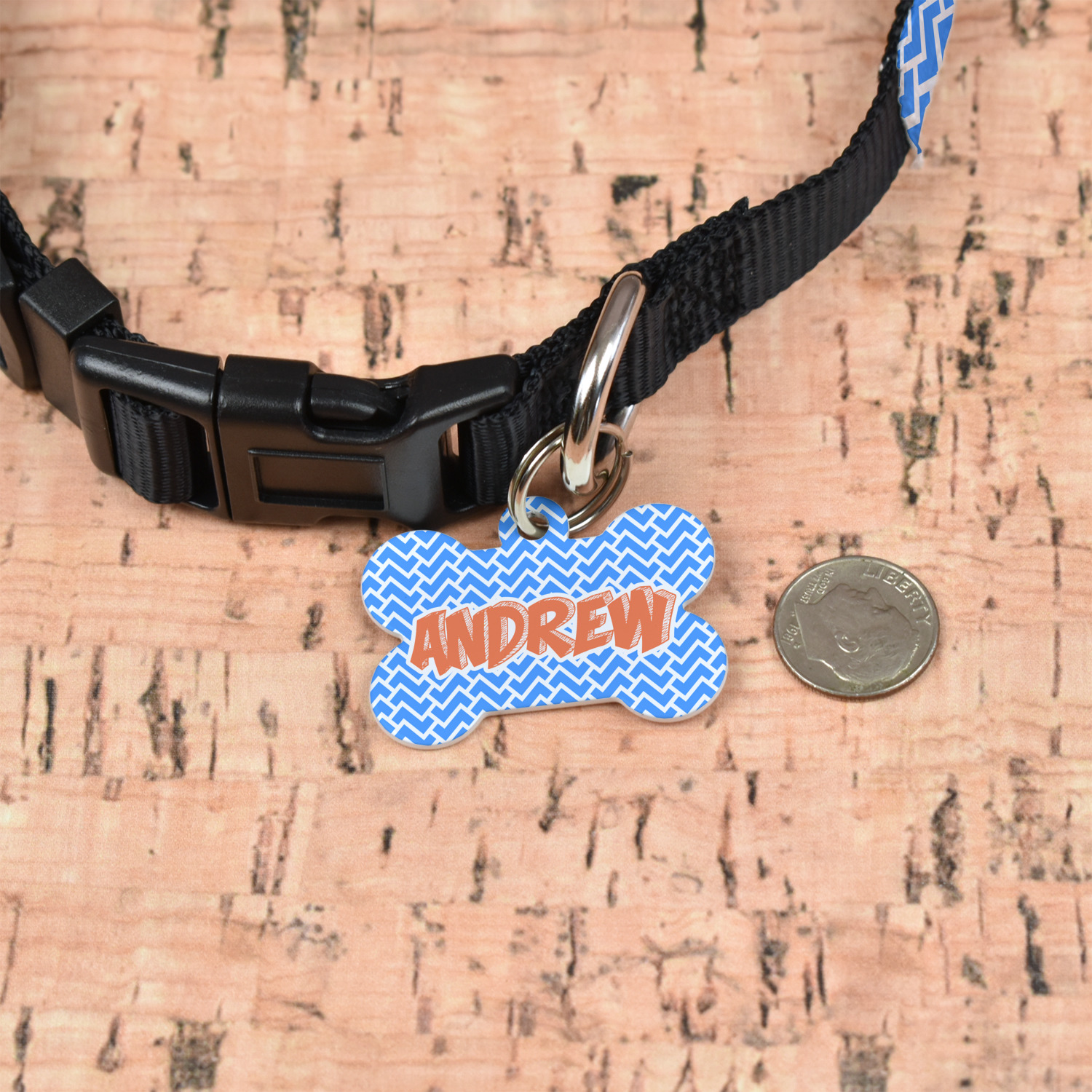 The small bone dog tag size is perfect to pair with our small dog collars, the large size pairs well with our large dog collars.