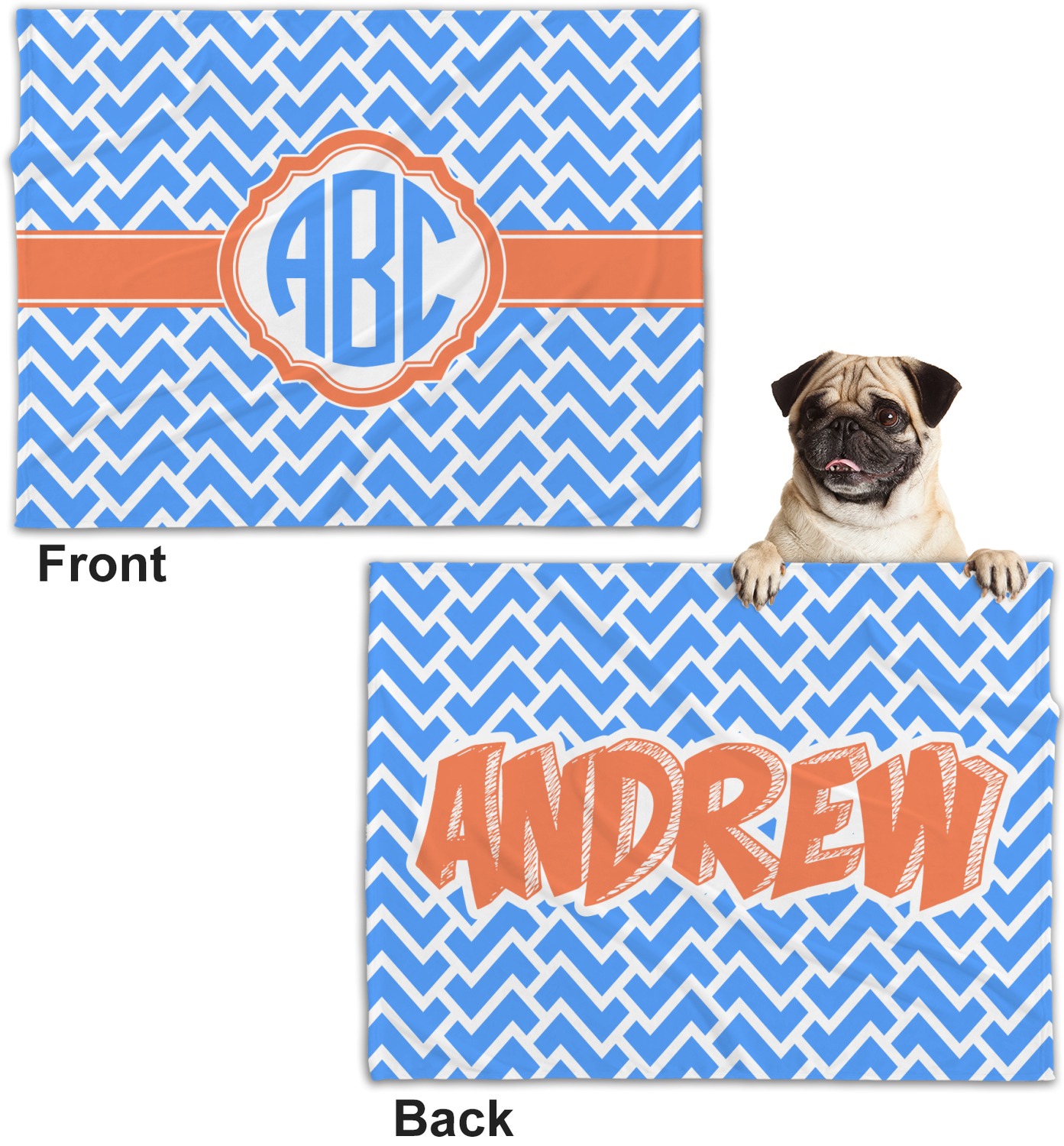 These dog blankets are crafted from a gentle, soft-to-the-touch, minky material. We print your customizations, either matching or differing, on both the top and underside of the blanket. These personalized dog blankets are available in two sizes: regular and large. Our regular size, at 40" x 30", accommodates small and some medium size dogs. At 60" x 50", our large dog blanket is a better fit for bigger breeds. Though specialized for dogs, these blankets still make a thoughtful gift for your favorite feline, or any other pet in mind!