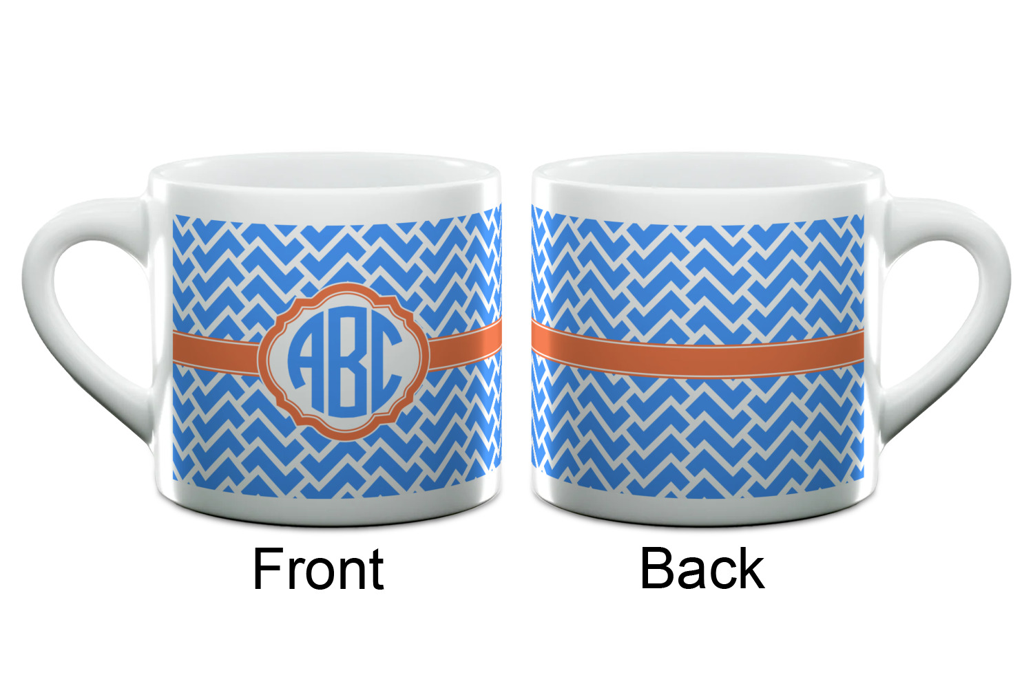 Each of our espresso mugs is a ceramic material sure to keep your drink warm. Personalize one cup for yourself, or order a set of 4! Its the perfect little gift for any coffee lover! We carry two sizes for you to personalize - 3 oz. (approx. 3.25" x 2.325" x 2.625") or 6 oz. (approx. 4" x 2.9" x 2.9"). Our 3 oz. mug is perfect for that single shot espresso while our 6 oz. mug can be your next favorite cappuccino cup holding two shots of espresso!