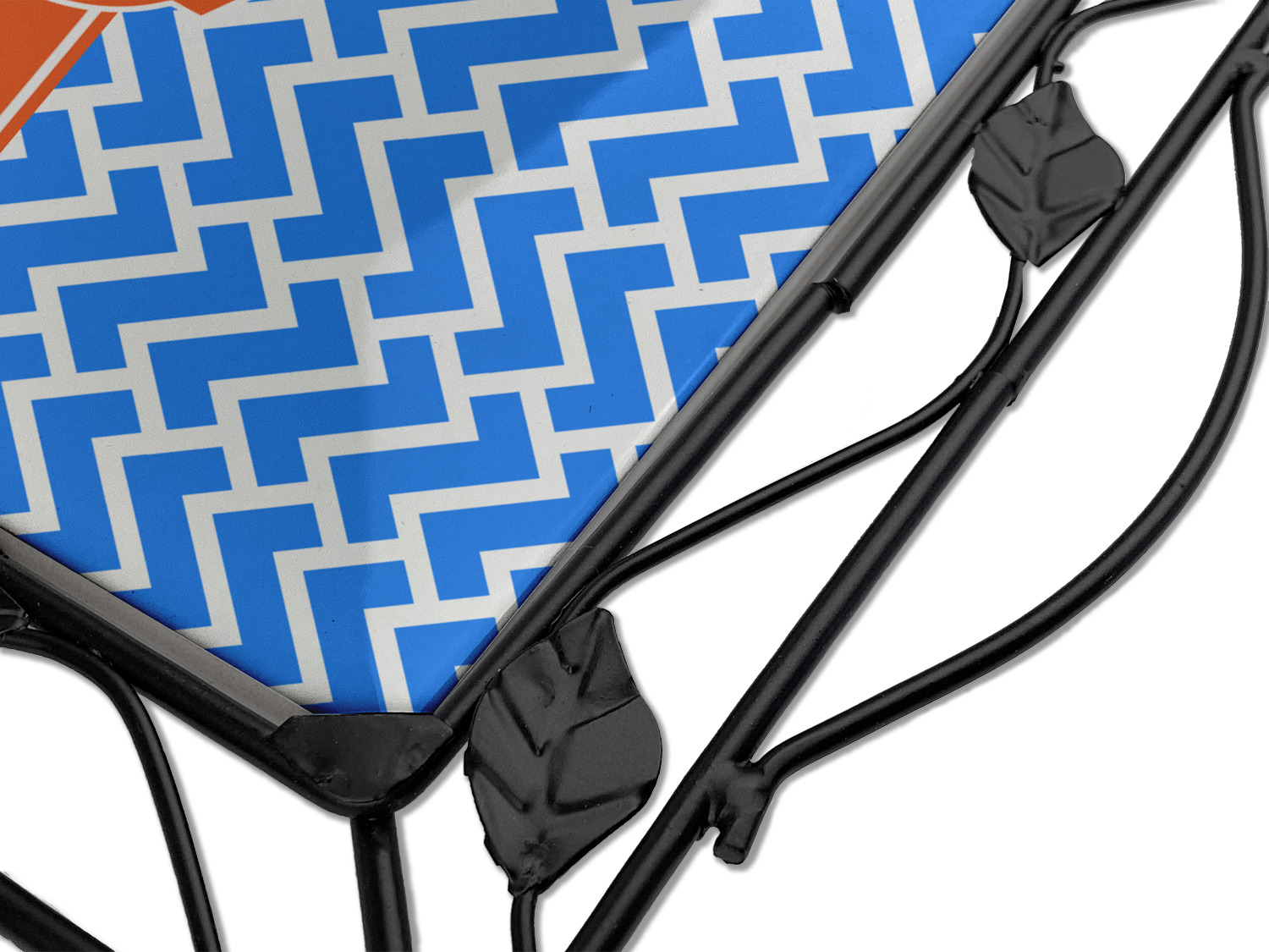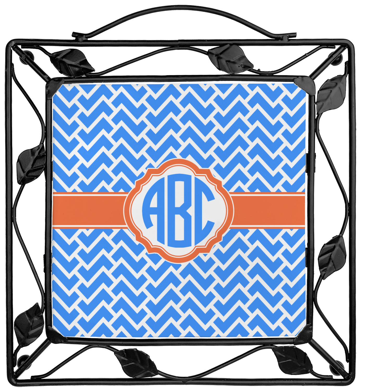 Our square trivets are made from a durable, wrought iron. This model features 4 small half circles, one on each corner, and a larger ring of iron that circles the central, customized tile. Each of the 4 corners has a round foot on its bottom for stability. This trivet is 8.75 by 8.75 inches, but the central tile measures at 6 inches on both sides.
