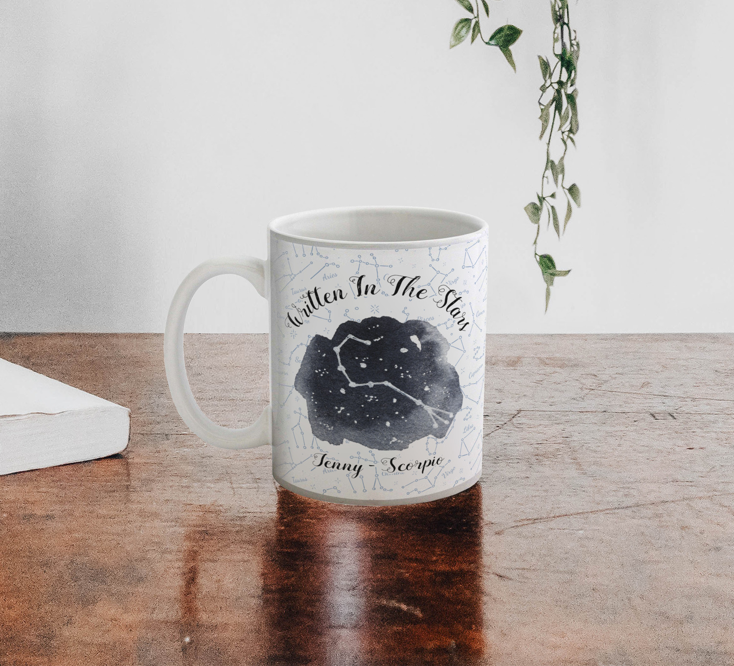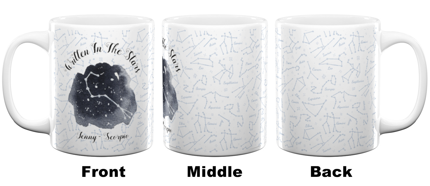 This design features a simplistic white and light blue background that has all of the zodiac constellations. The focal point of the design is your very own zodiac constellation surrounded by a sea of dark blue. It looks as if you are peeking into the night sky. Around this graphic is where you can put a phrase of your choosing and your personalization.