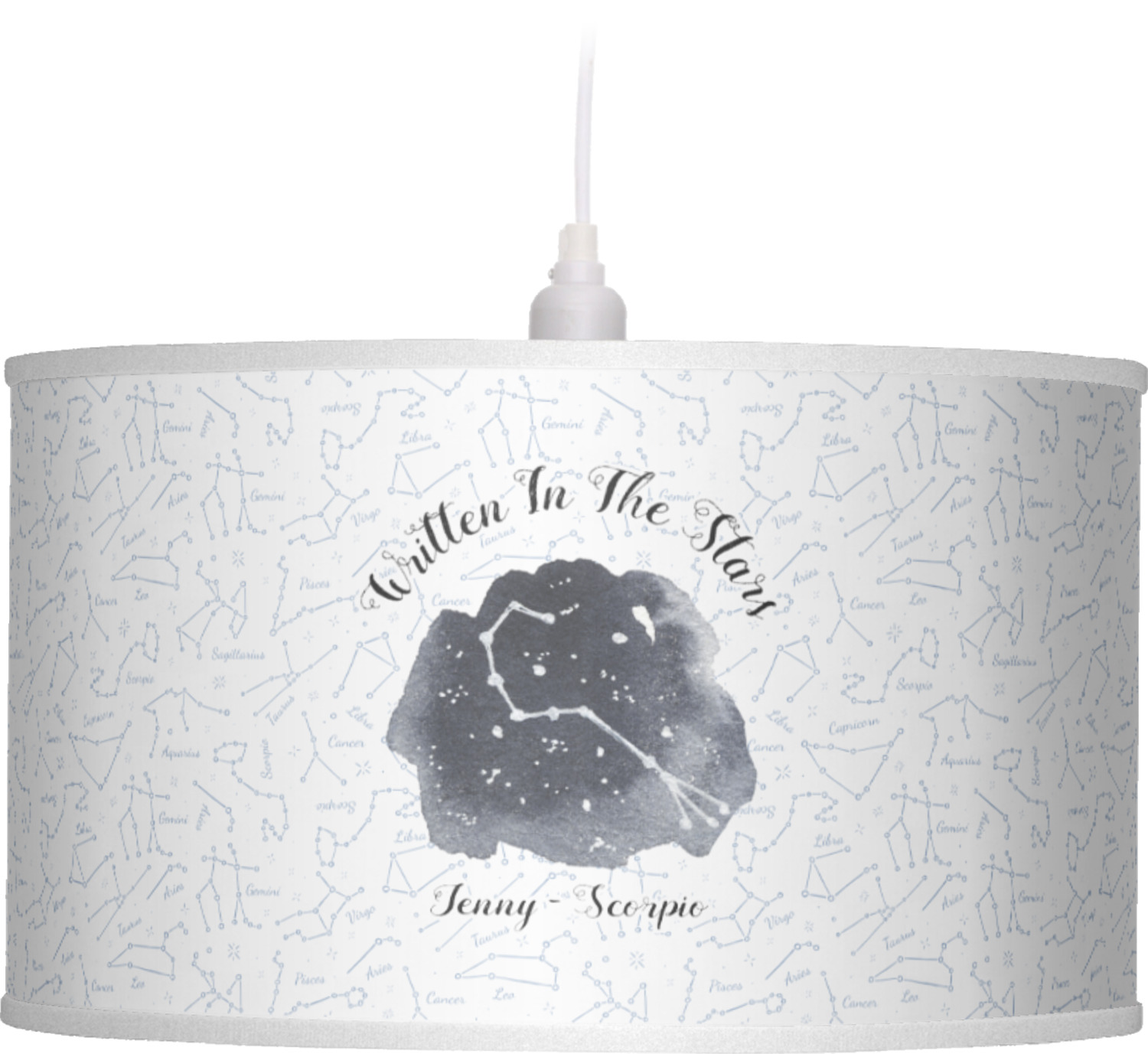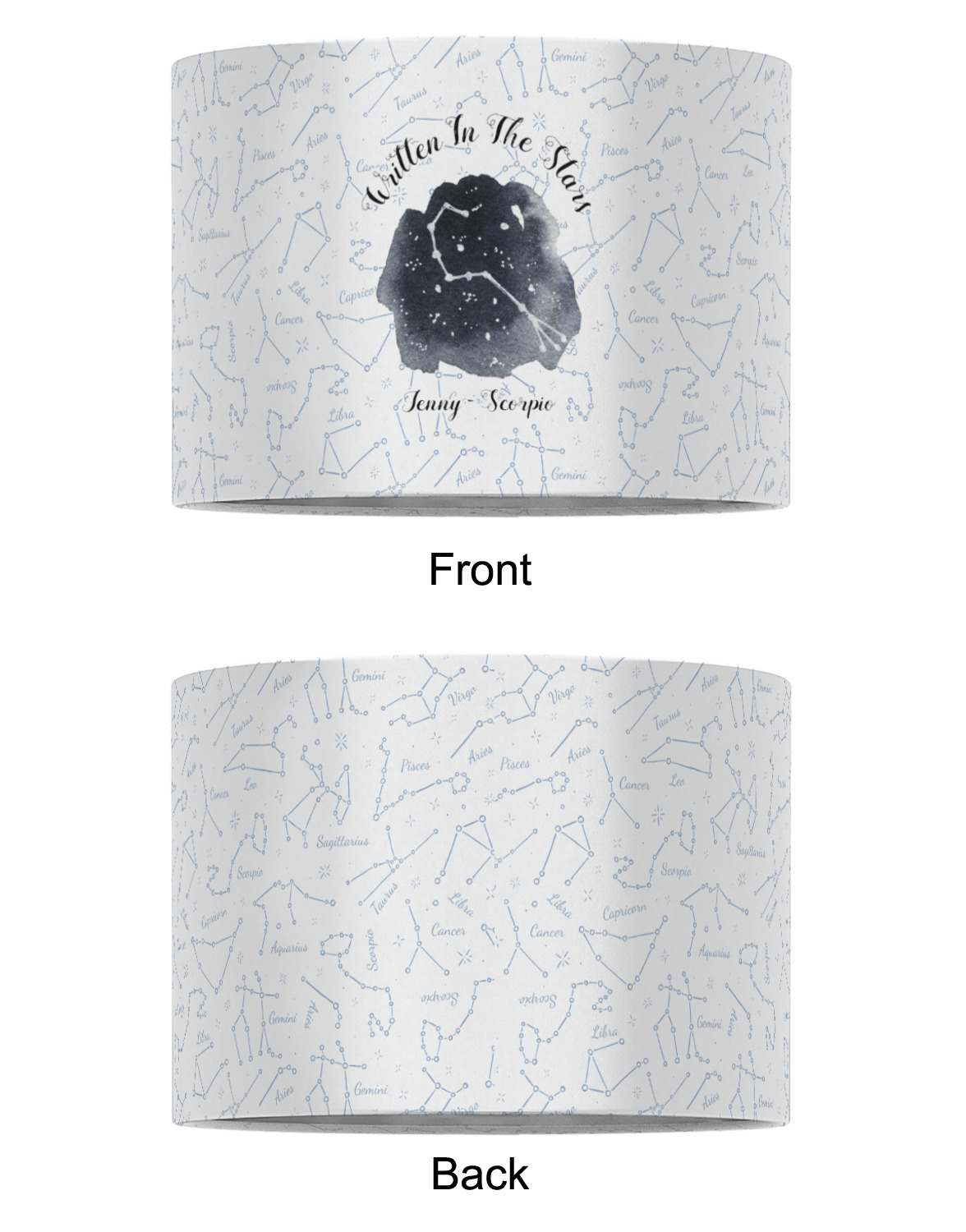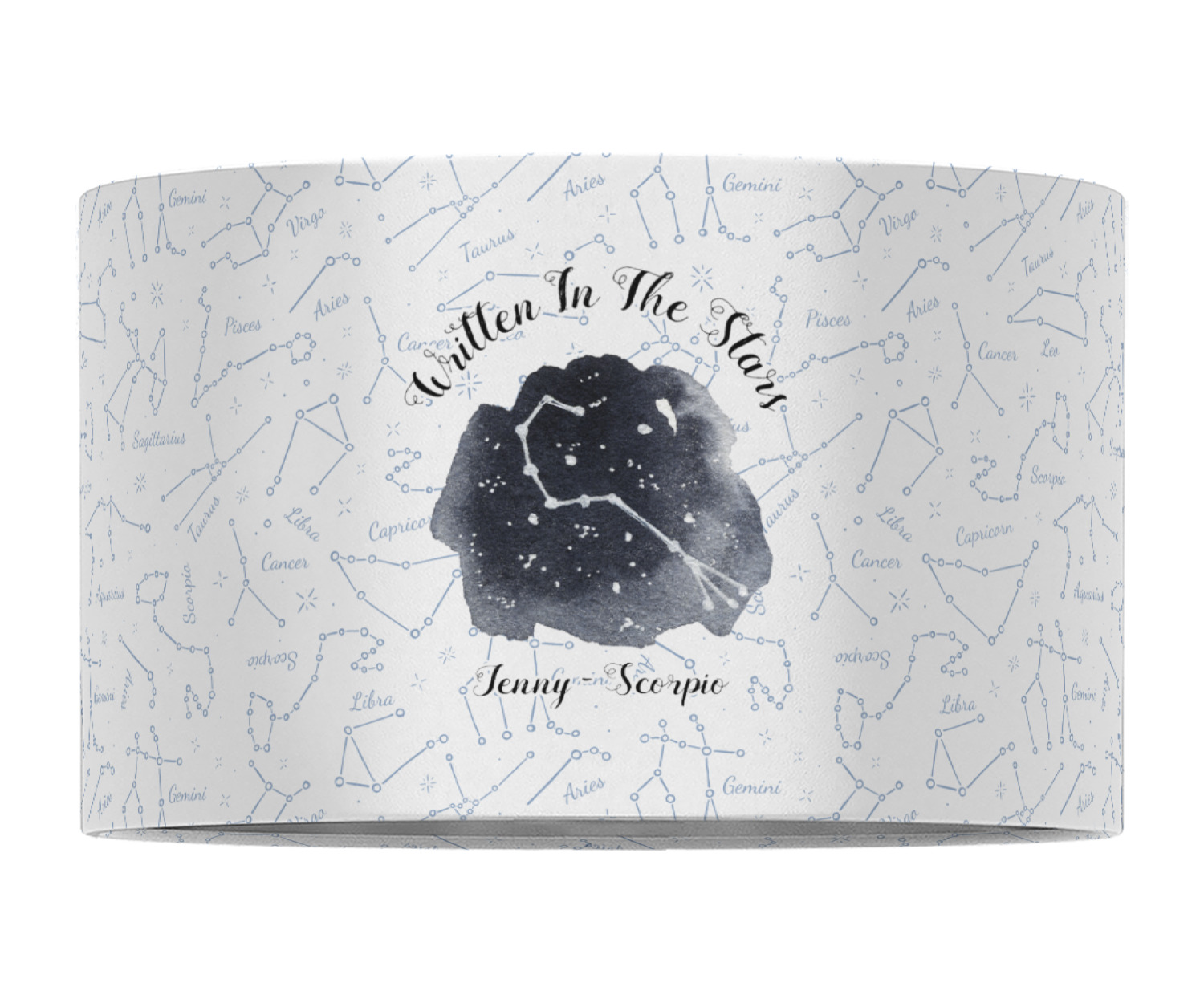 This design features a simplistic white and light blue background that has all of the zodiac constellations. The focal point of the design is your very own zodiac constellation surrounded by a sea of dark blue. It looks as if you are peeking into the night sky. Around this graphic is where you can put a phrase of your choosing and your personalization.