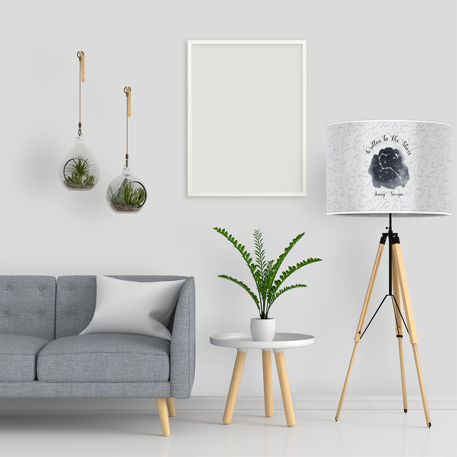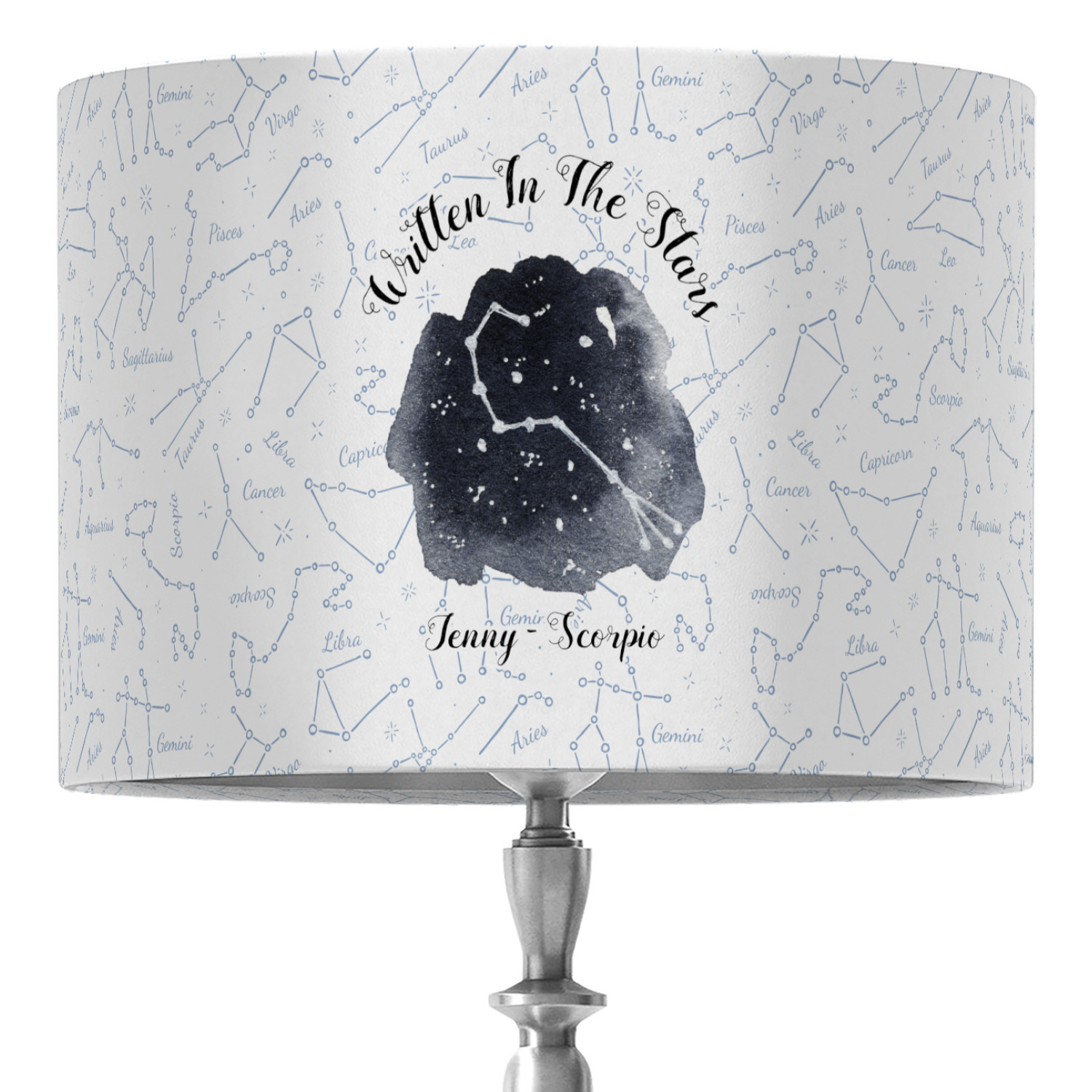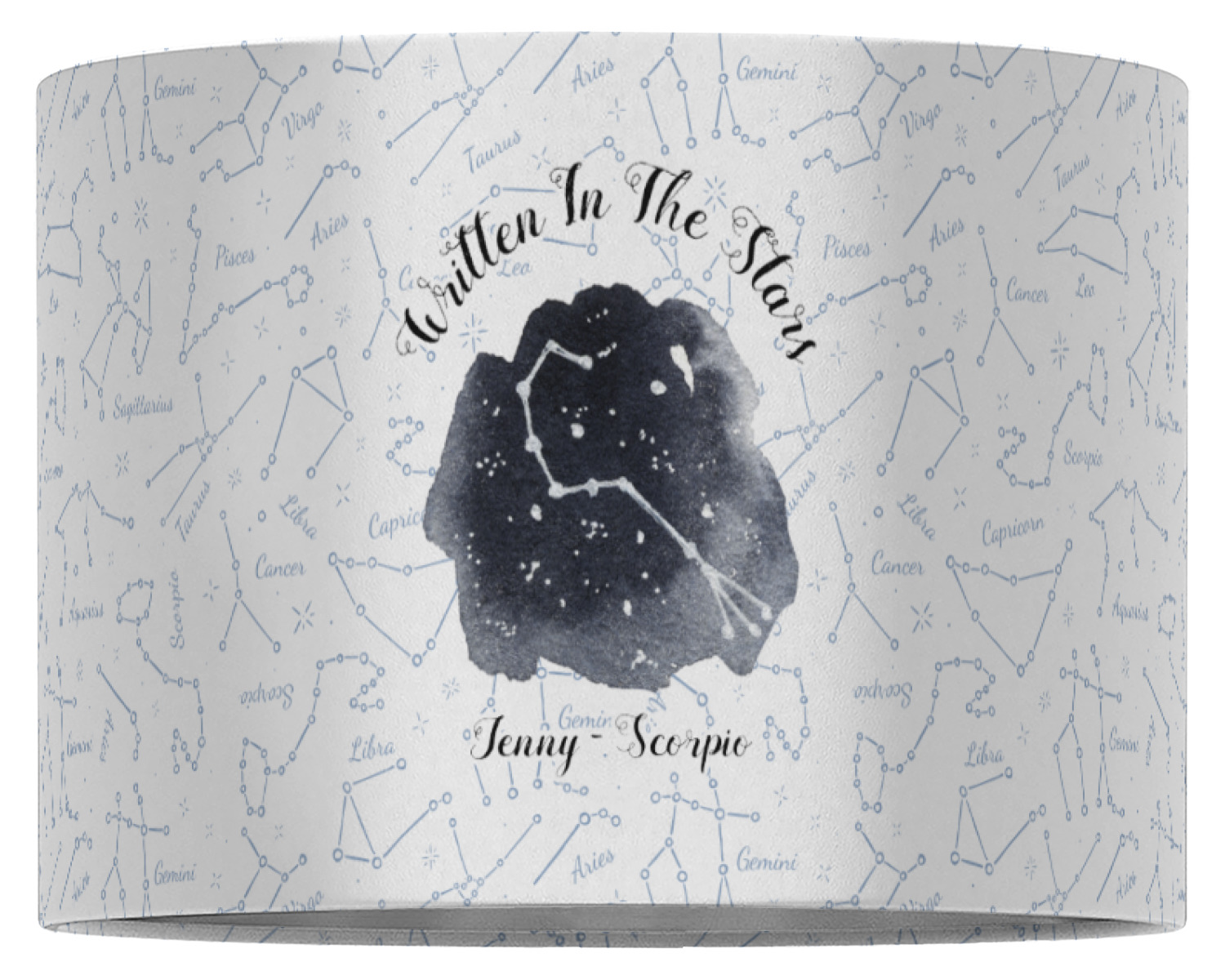 This design features a simplistic white and light blue background that has all of the zodiac constellations. The focal point of the design is your very own zodiac constellation surrounded by a sea of dark blue. It looks as if you are peeking into the night sky. Around this graphic is where you can put a phrase of your choosing and your personalization.