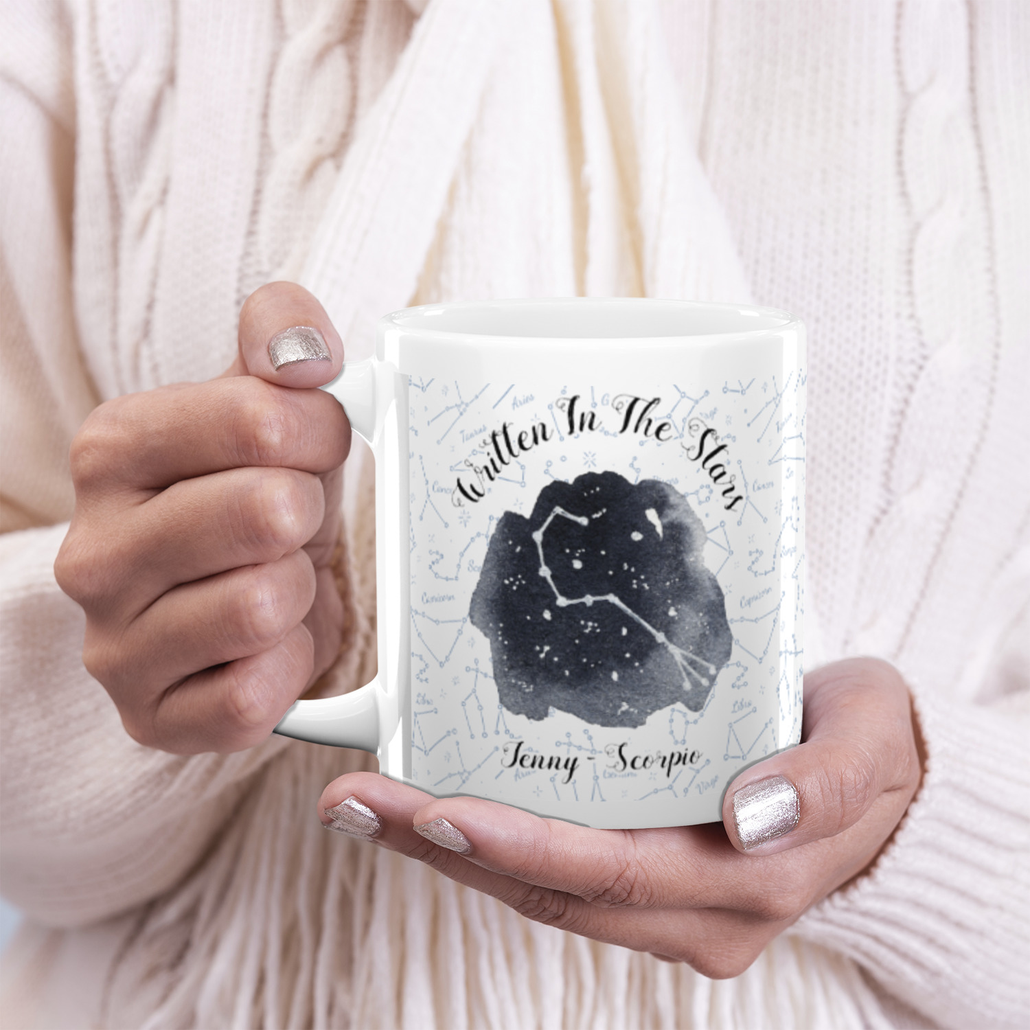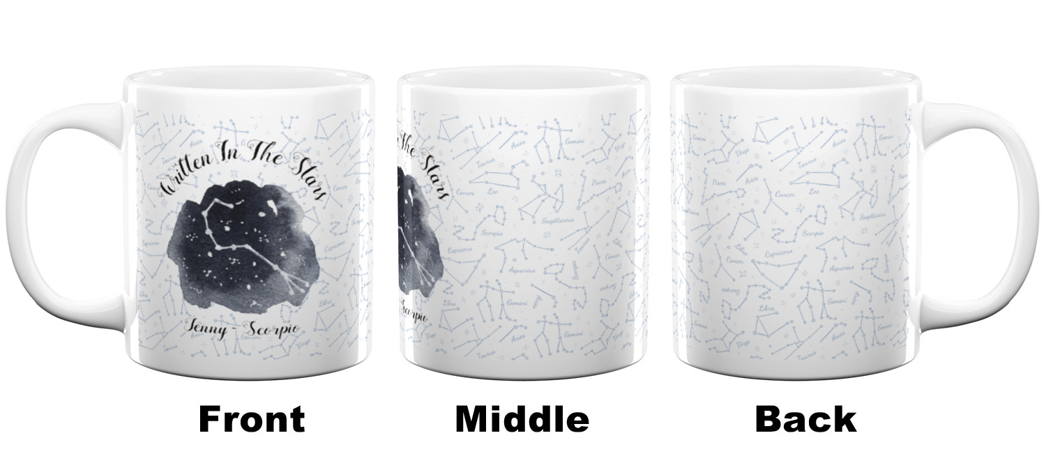 This design features a simplistic white and light blue background that has all of the zodiac constellations. The focal point of the design is your very own zodiac constellation surrounded by a sea of dark blue. It looks as if you are peeking into the night sky. Around this graphic is where you can put a phrase of your choosing and your personalization.