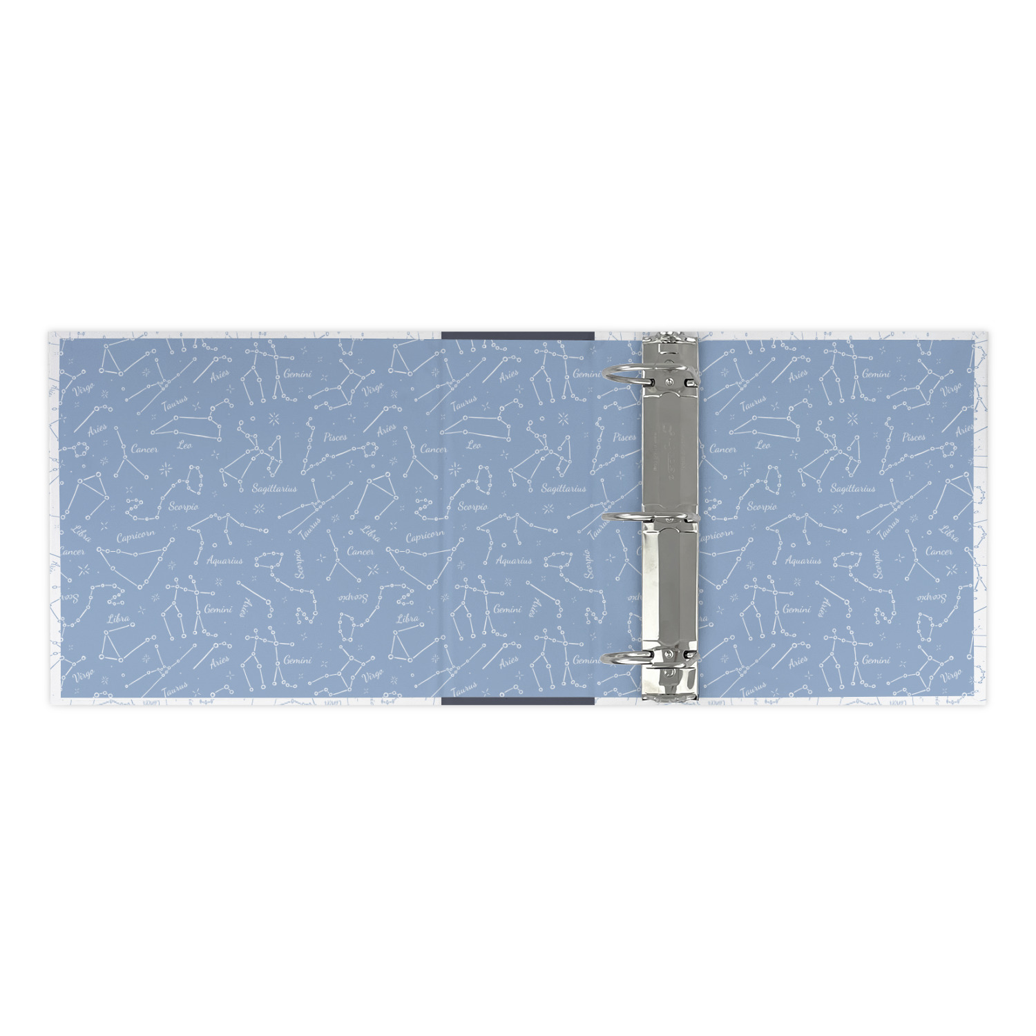 This design features a simplistic white and light blue background that has all of the zodiac constellations. The focal point of the design is your very own zodiac constellation surrounded by a sea of dark blue. It looks as if you are peeking into the night sky. Around this graphic is where you can put a phrase of your choosing and your personalization.