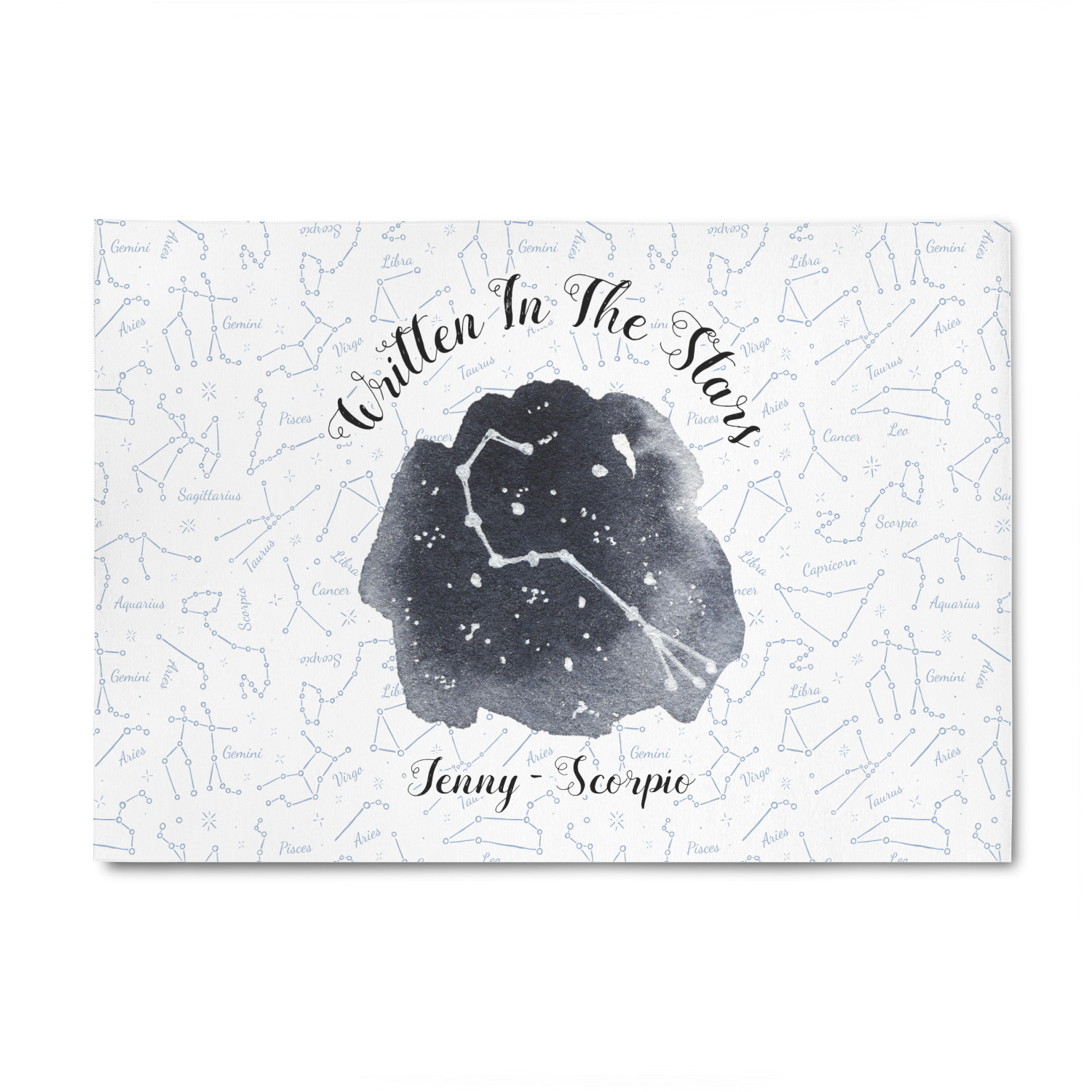 This design features a simplistic white and light blue background that has all of the zodiac constellations. The focal point of the design is your very own zodiac constellation surrounded by a sea of dark blue. It looks as if you are peeking into the night sky. Around this graphic is where you can put a phrase of your choosing and your personalization.