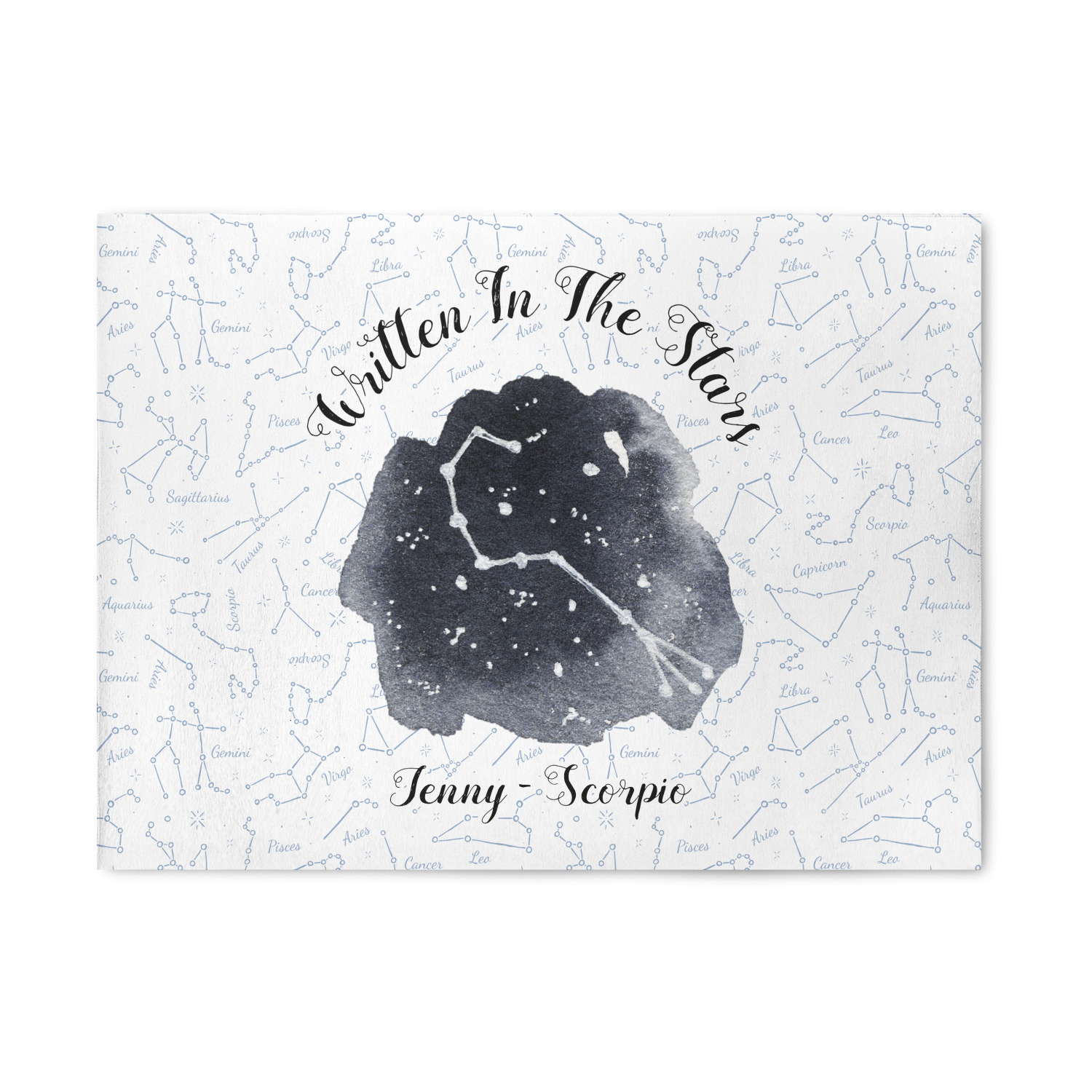 This design features a simplistic white and light blue background that has all of the zodiac constellations. The focal point of the design is your very own zodiac constellation surrounded by a sea of dark blue. It looks as if you are peeking into the night sky. Around this graphic is where you can put a phrase of your choosing and your personalization.