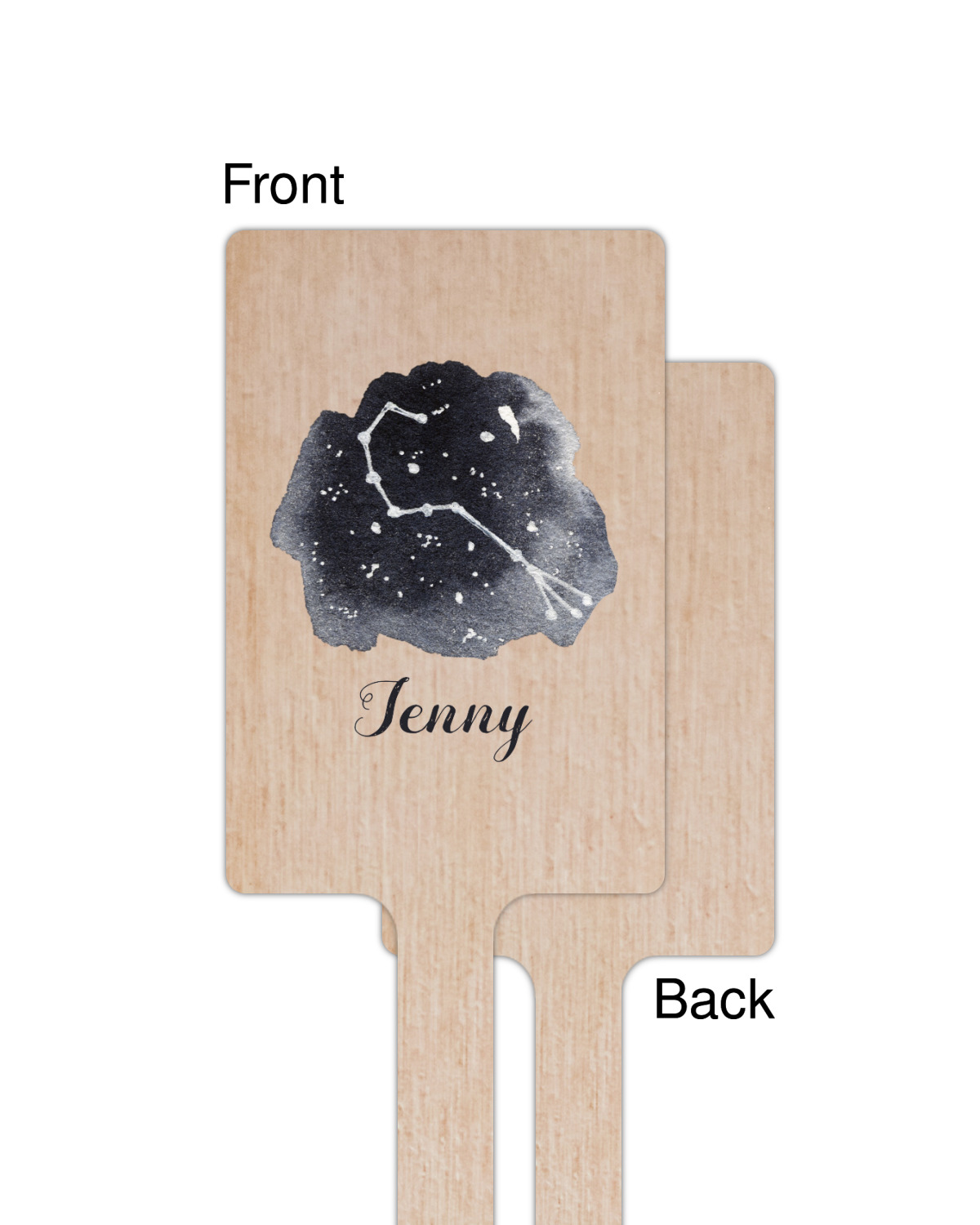 This design features a simplistic white and light blue background that has all of the zodiac constellations. The focal point of the design is your very own zodiac constellation surrounded by a sea of dark blue. It looks as if you are peeking into the night sky. Around this graphic is where you can put a phrase of your choosing and your personalization.
