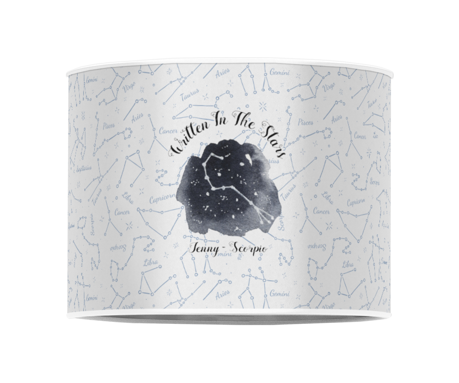 This design features a simplistic white and light blue background that has all of the zodiac constellations. The focal point of the design is your very own zodiac constellation surrounded by a sea of dark blue. It looks as if you are peeking into the night sky. Around this graphic is where you can put a phrase of your choosing and your personalization.
