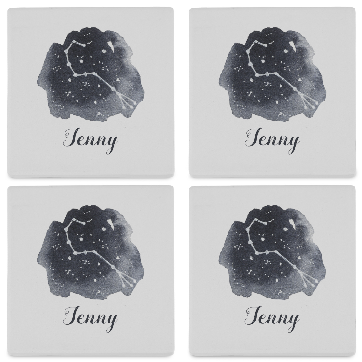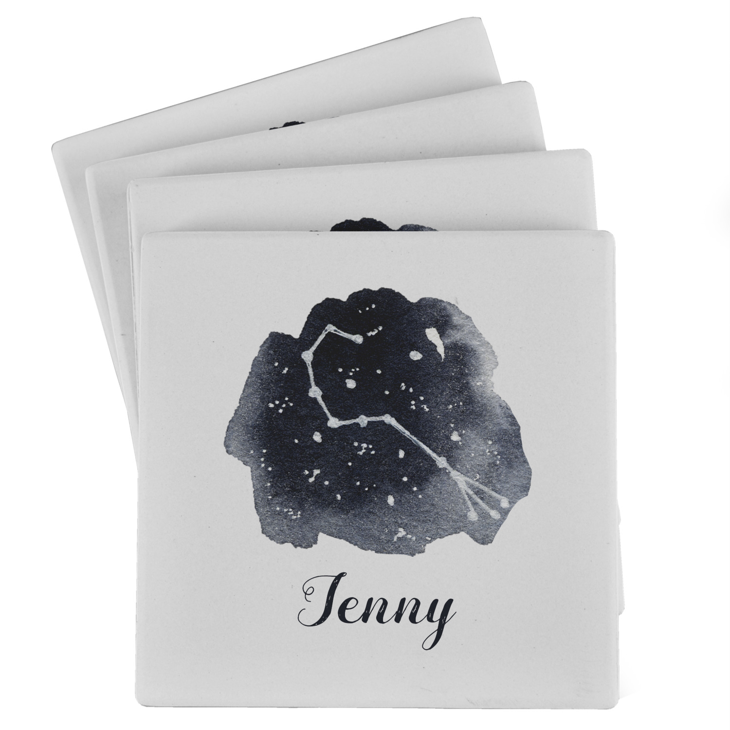 This design features a simplistic white and light blue background that has all of the zodiac constellations. The focal point of the design is your very own zodiac constellation surrounded by a sea of dark blue. It looks as if you are peeking into the night sky. Around this graphic is where you can put a phrase of your choosing and your personalization.