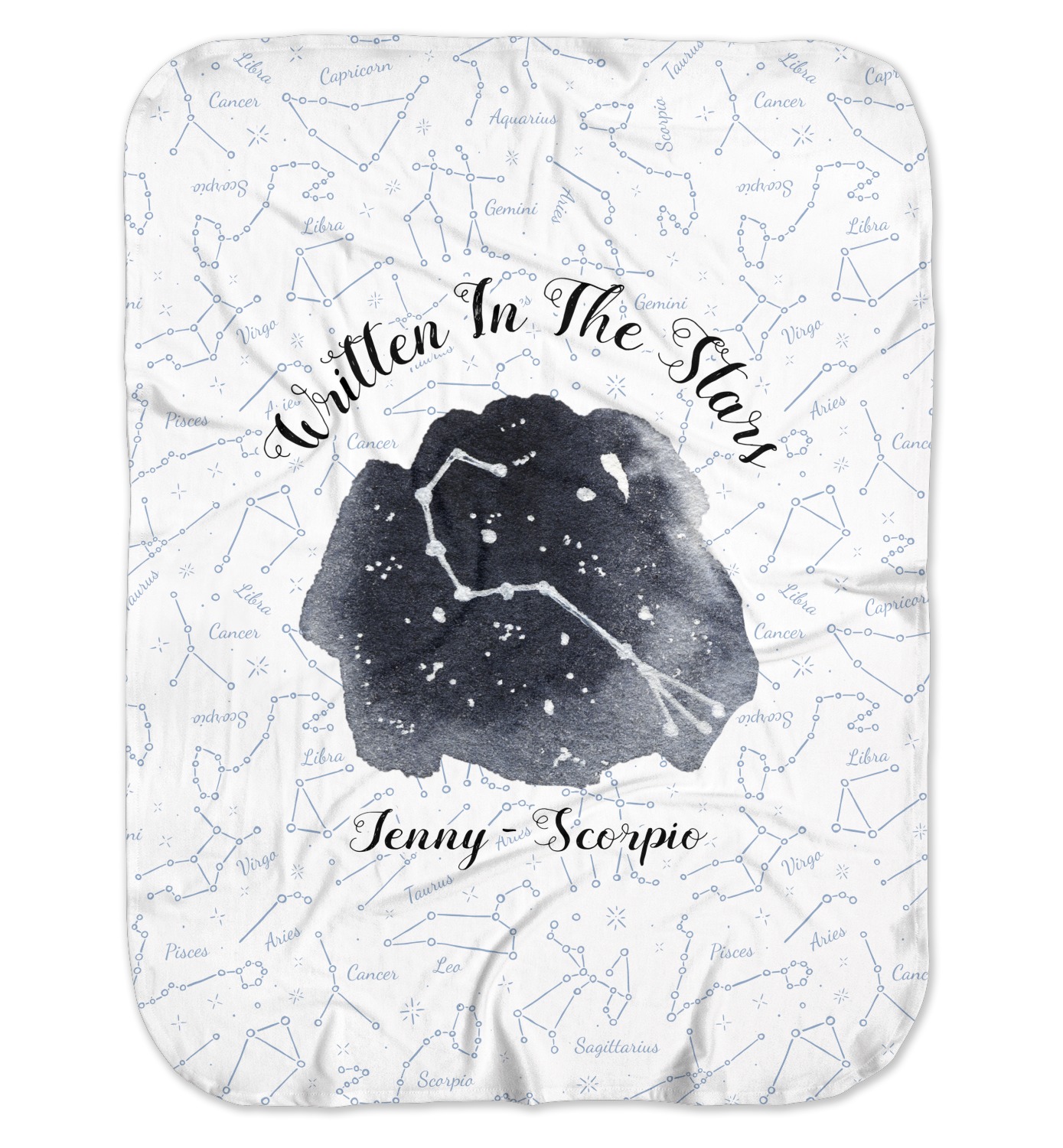 This design features a simplistic white and light blue background that has all of the zodiac constellations. The focal point of the design is your very own zodiac constellation surrounded by a sea of dark blue. It looks as if you are peeking into the night sky. Around this graphic is where you can put a phrase of your choosing and your personalization.