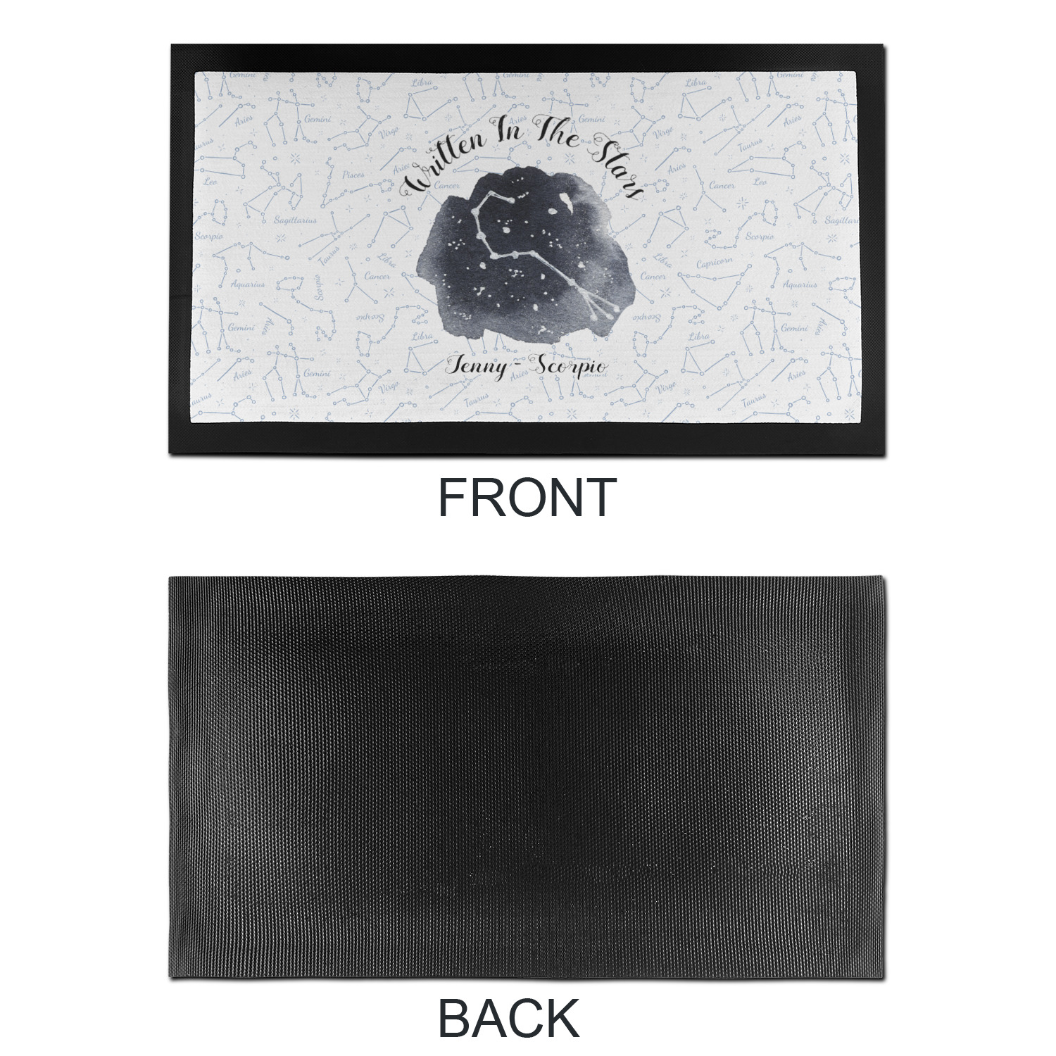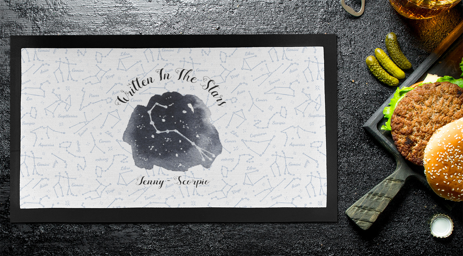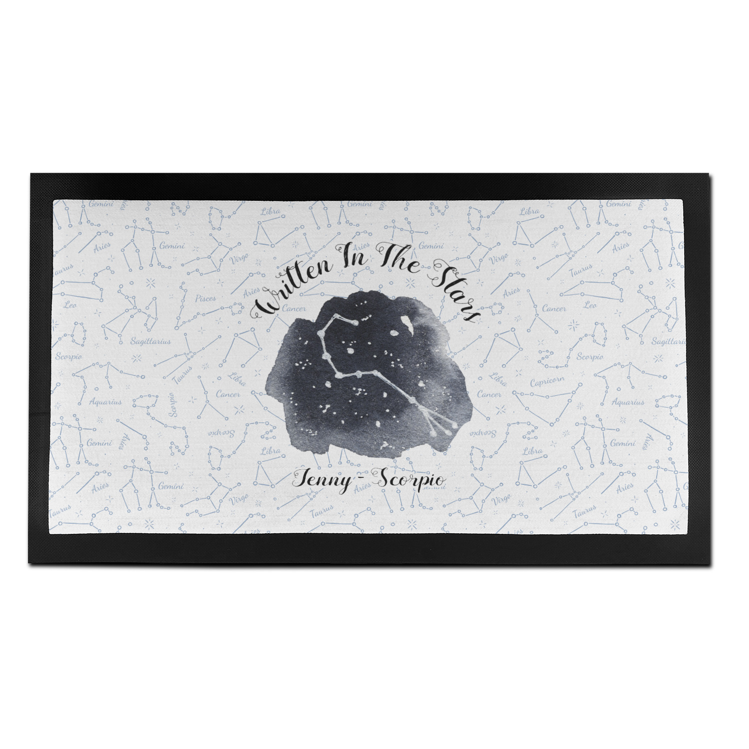 This design features a simplistic white and light blue background that has all of the zodiac constellations. The focal point of the design is your very own zodiac constellation surrounded by a sea of dark blue. It looks as if you are peeking into the night sky. Around this graphic is where you can put a phrase of your choosing and your personalization.