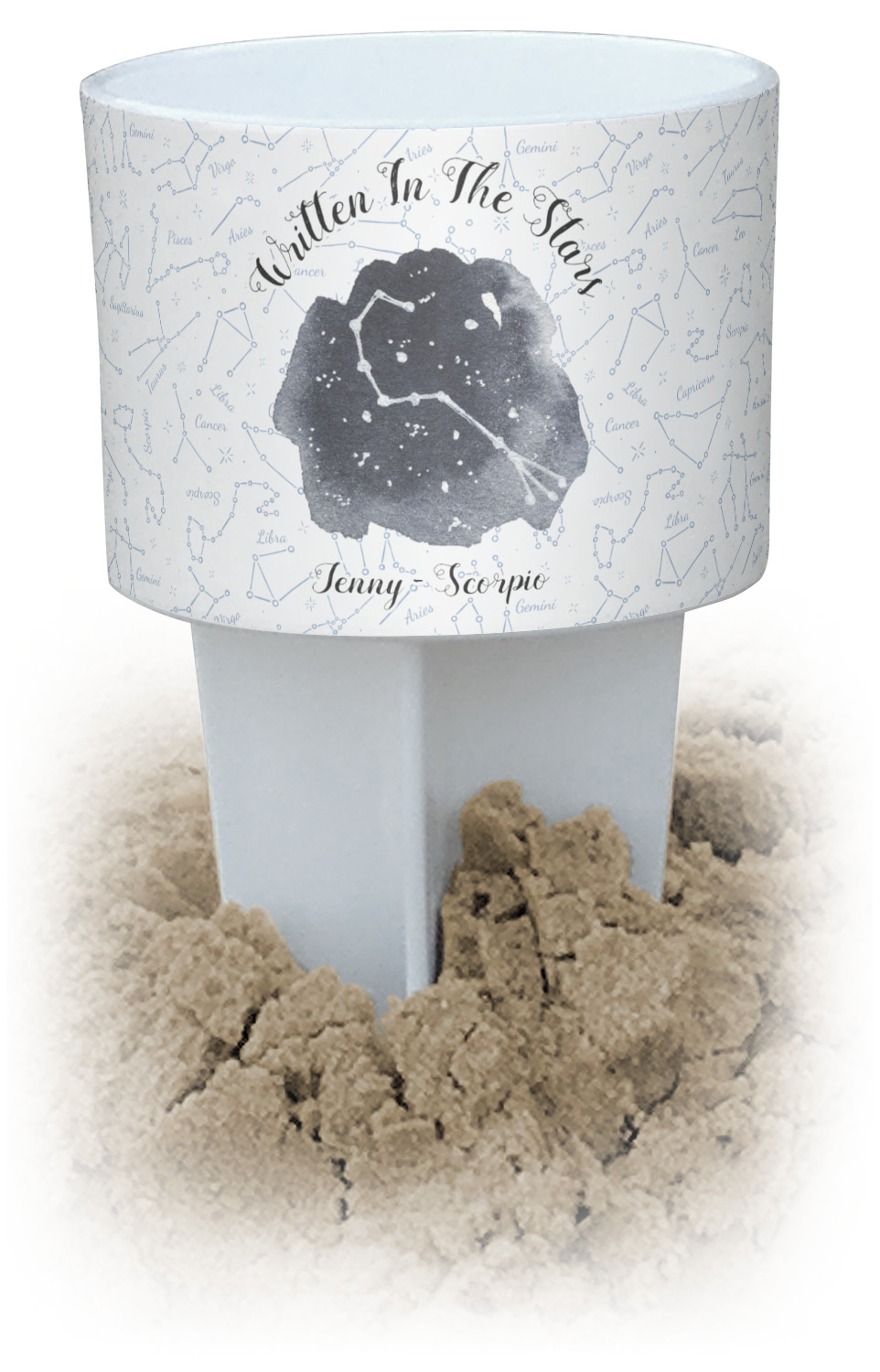 This cup holder has a large stake at its bottom that anchors it to the sand or ground below, while the cup holder rests above the stake. The entire drink holder is made of durable plastic and displays your customization around the cup holder portion. We sell these personalized beach spikers in two different colors: black and white.