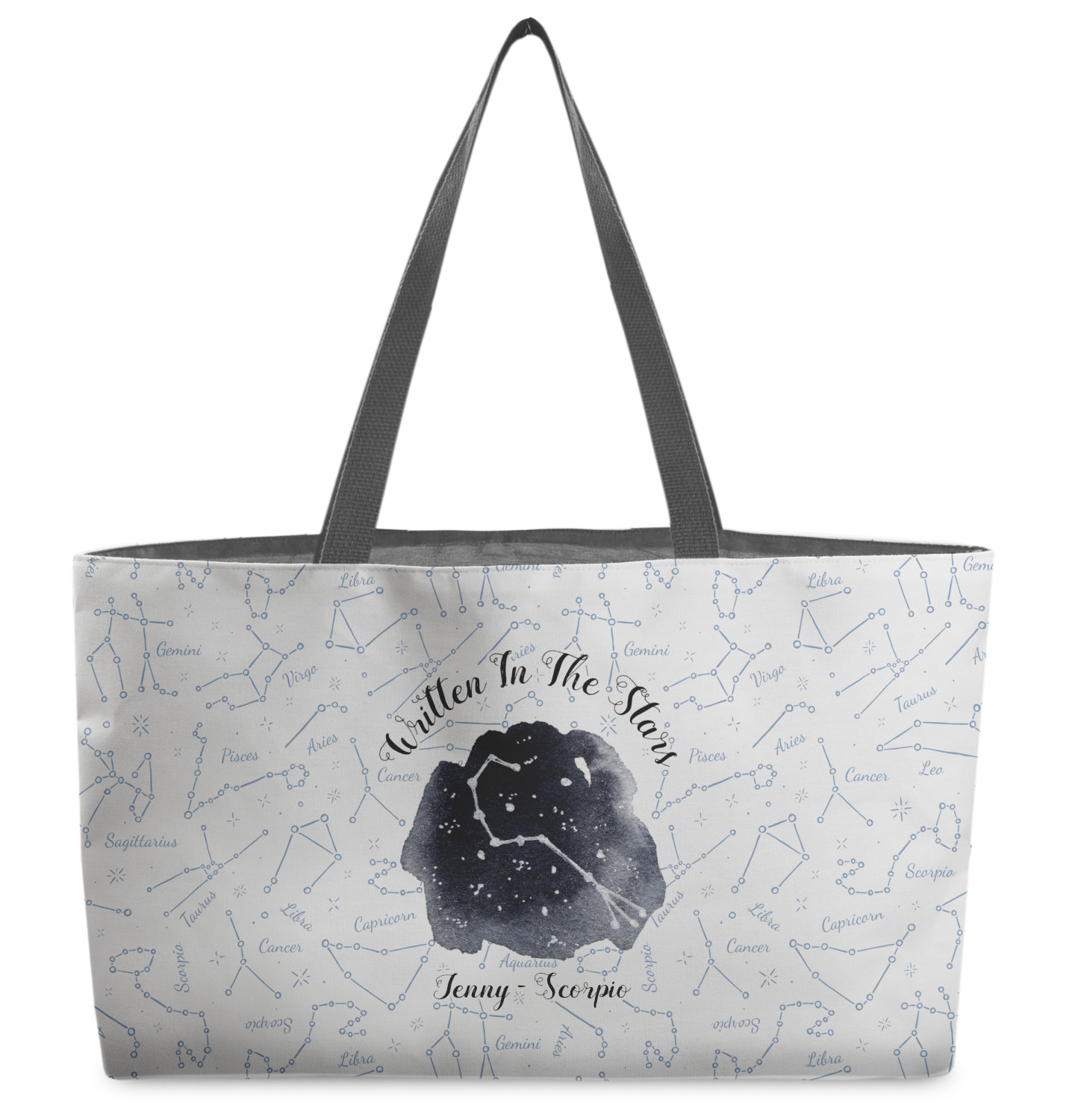 This design features a simplistic white and light blue background that has all of the zodiac constellations. The focal point of the design is your very own zodiac constellation surrounded by a sea of dark blue. It looks as if you are peeking into the night sky. Around this graphic is where you can put a phrase of your choosing and your personalization.