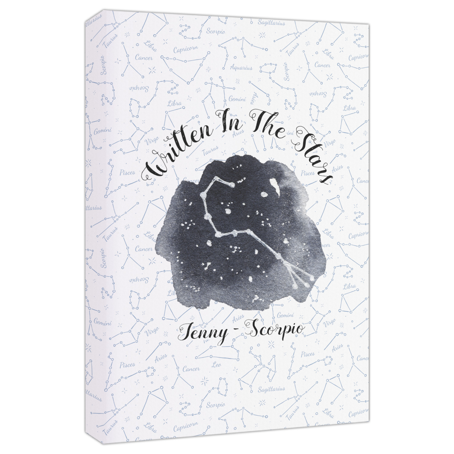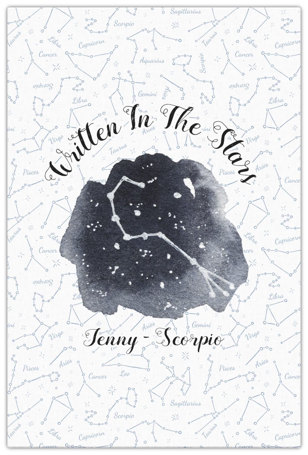 This design features a simplistic white and light blue background that has all of the zodiac constellations. The focal point of the design is your very own zodiac constellation surrounded by a sea of dark blue. It looks as if you are peeking into the night sky. Around this graphic is where you can put a phrase of your choosing and your personalization.