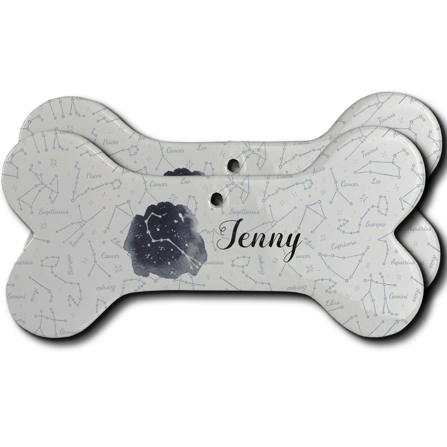 This design features a simplistic white and light blue background that has all of the zodiac constellations. The focal point of the design is your very own zodiac constellation surrounded by a sea of dark blue. It looks as if you are peeking into the night sky. Around this graphic is where you can put a phrase of your choosing and your personalization.