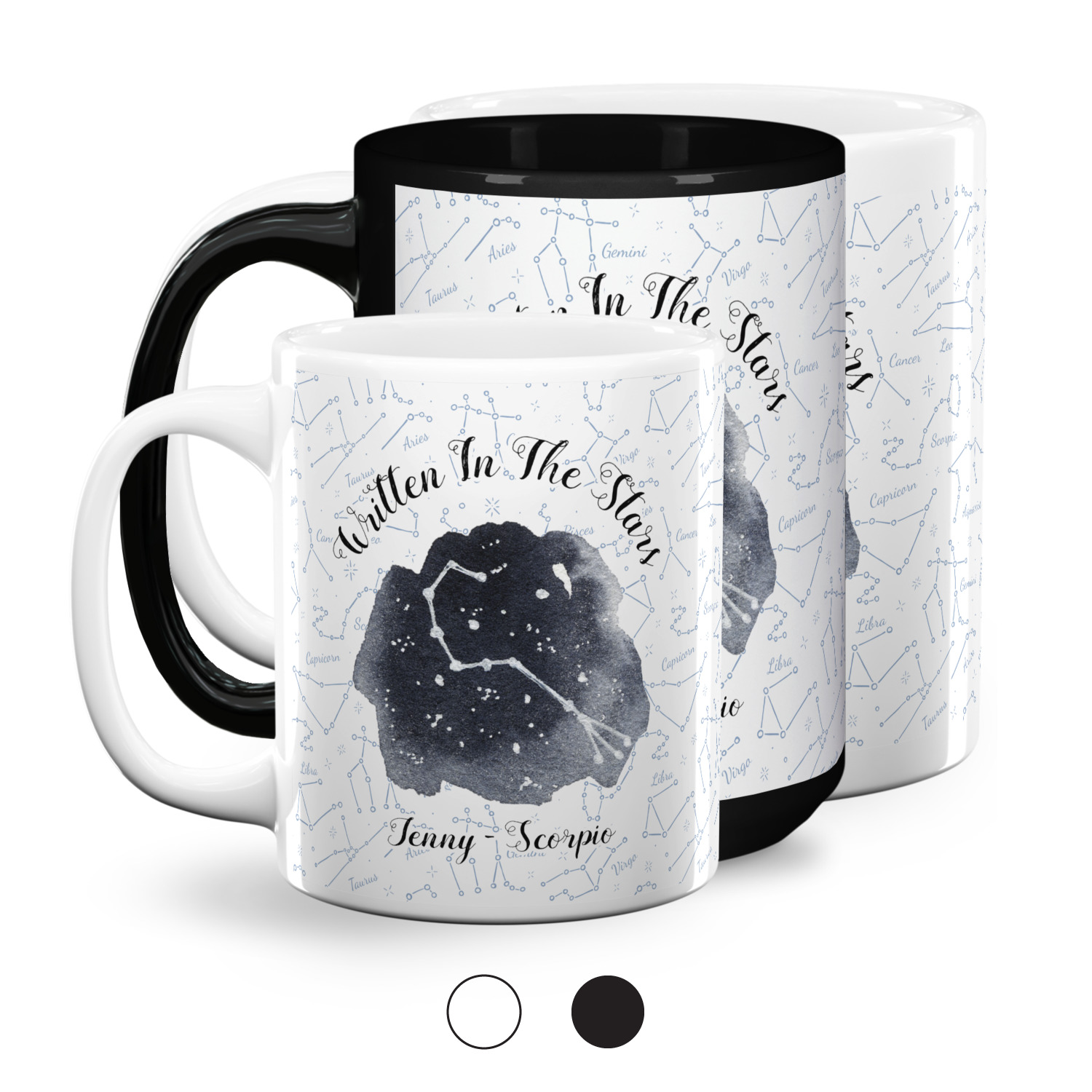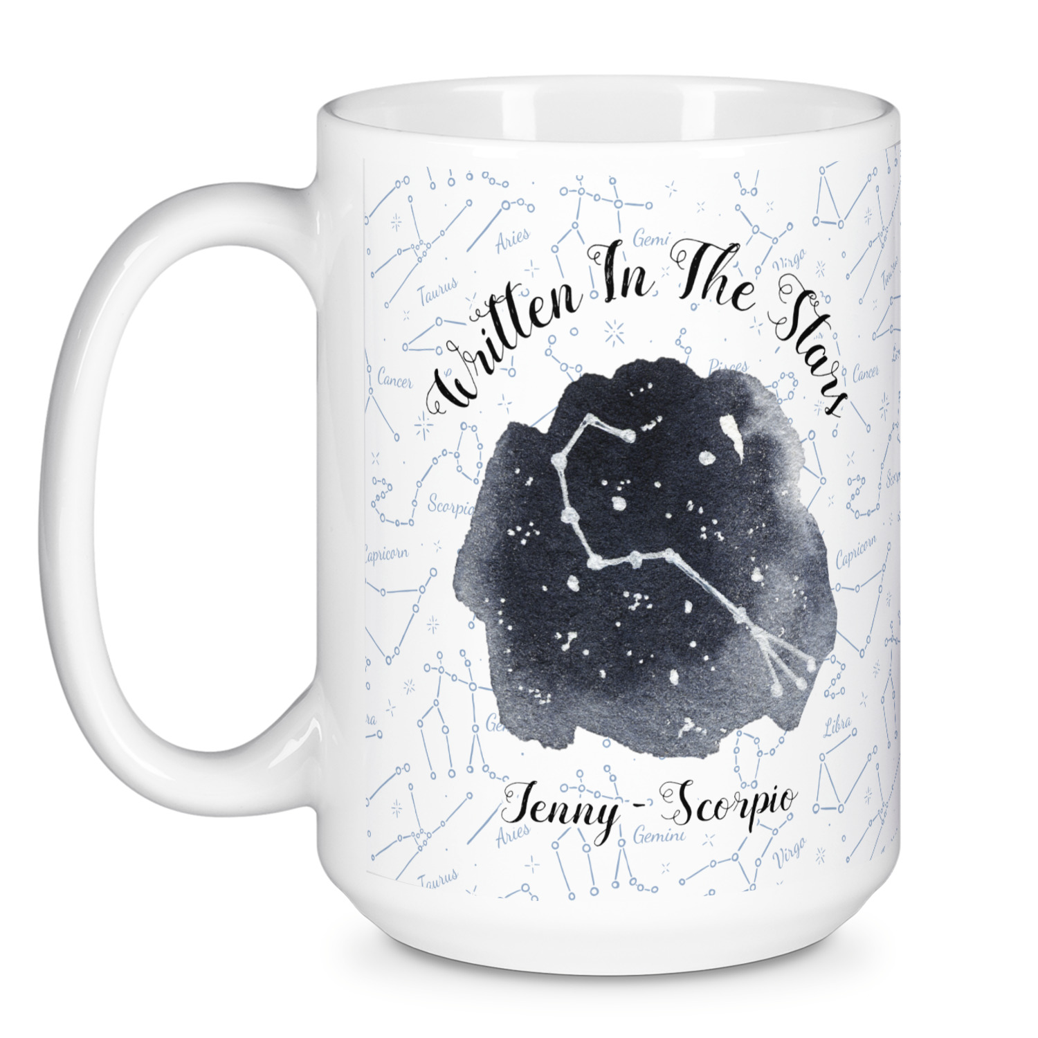 This design features a simplistic white and light blue background that has all of the zodiac constellations. The focal point of the design is your very own zodiac constellation surrounded by a sea of dark blue. It looks as if you are peeking into the night sky. Around this graphic is where you can put a phrase of your choosing and your personalization.