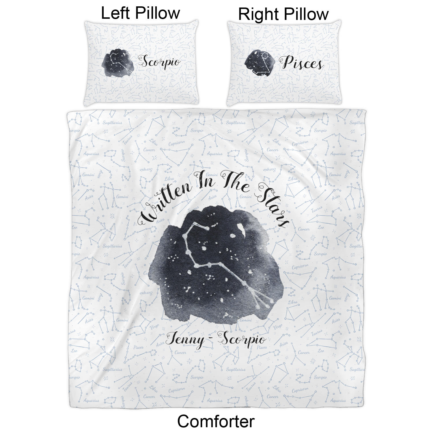 We have hundreds of different design templates for you to choose from Each design can be customized to your exact specifications. Not only can you customize the comforter, but you can also customize each pillow sham e.g. for a queen comforter set you have have Mr & Mrs pillow shams with the last name on comforter.