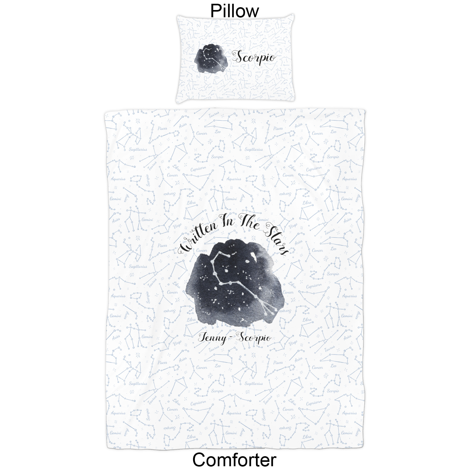 We have hundreds of different design templates for you to choose from Each design can be customized to your exact specifications. Not only can you customize the comforter, but you can also customize each pillow sham e.g. for a queen comforter set you have have Mr & Mrs pillow shams with the last name on comforter.
