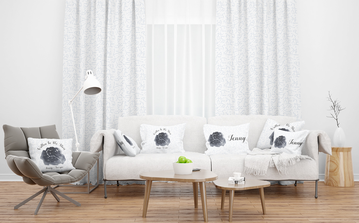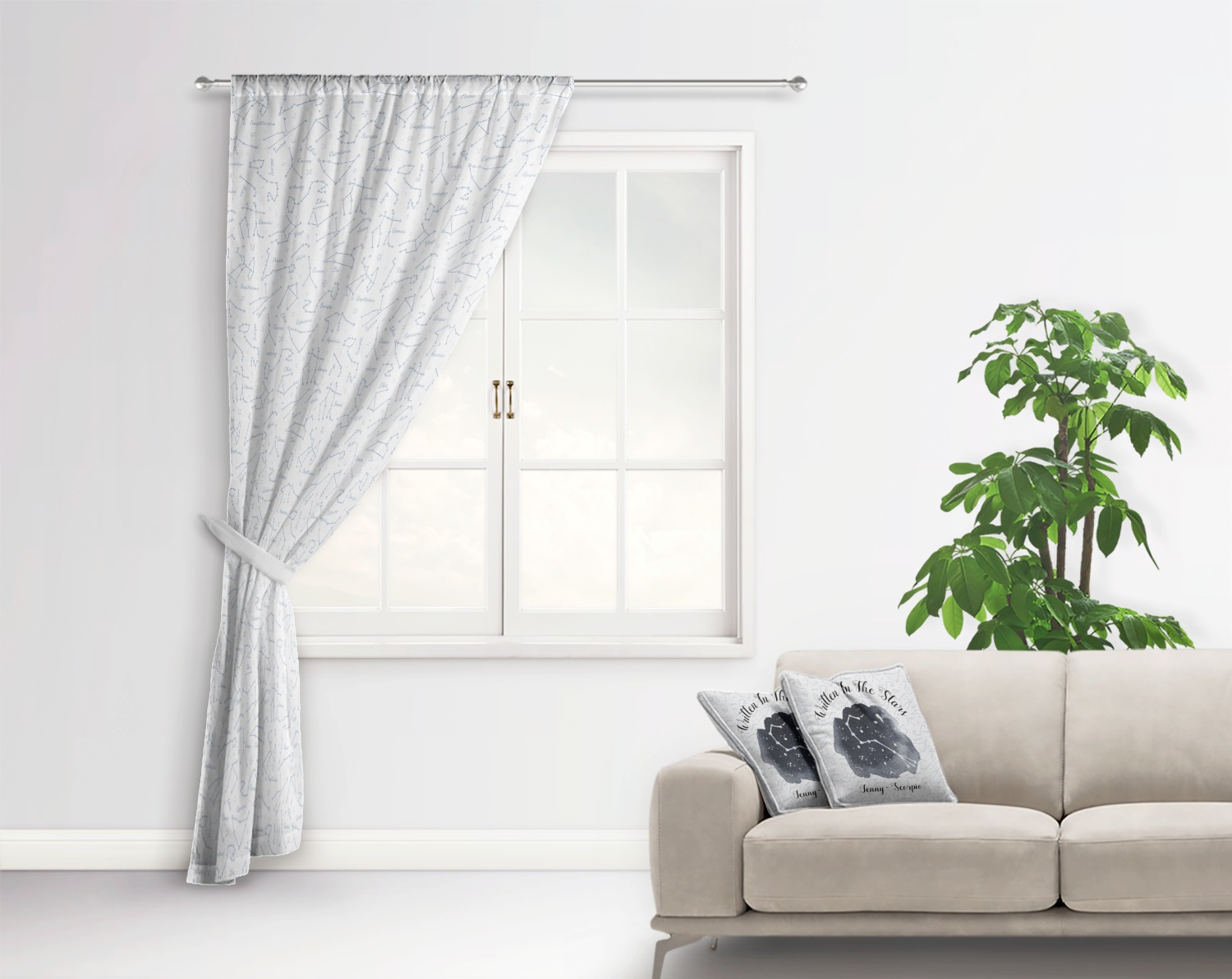 This design features a simplistic white and light blue background that has all of the zodiac constellations. The focal point of the design is your very own zodiac constellation surrounded by a sea of dark blue. It looks as if you are peeking into the night sky. Around this graphic is where you can put a phrase of your choosing and your personalization.
