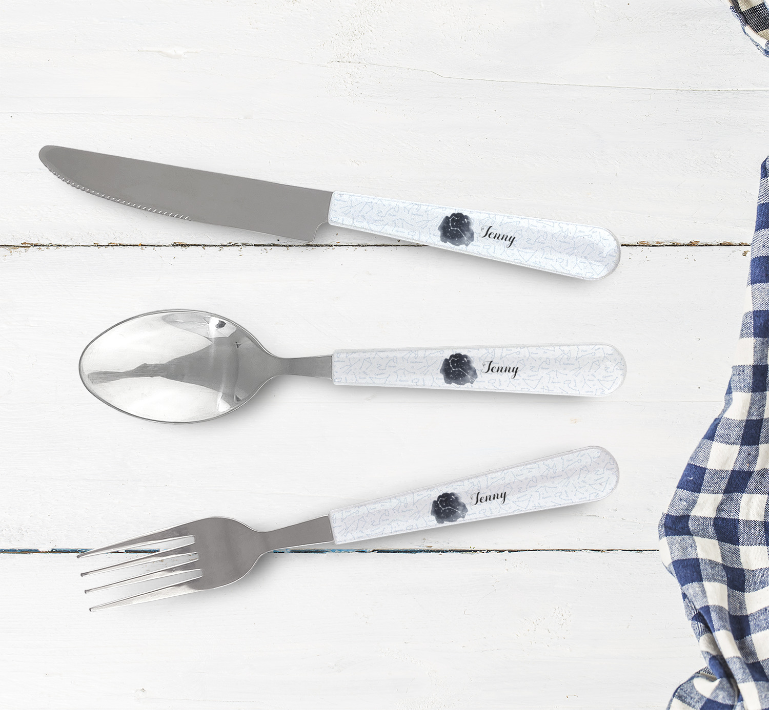 One of those items we all use on a daily basis and never give it much thought - cutlery. Having your own customized set of cutlery adds that special touch. A great addition to our custom plates and drinking pint glasses, this flatware set can be made in the same patterns to match.