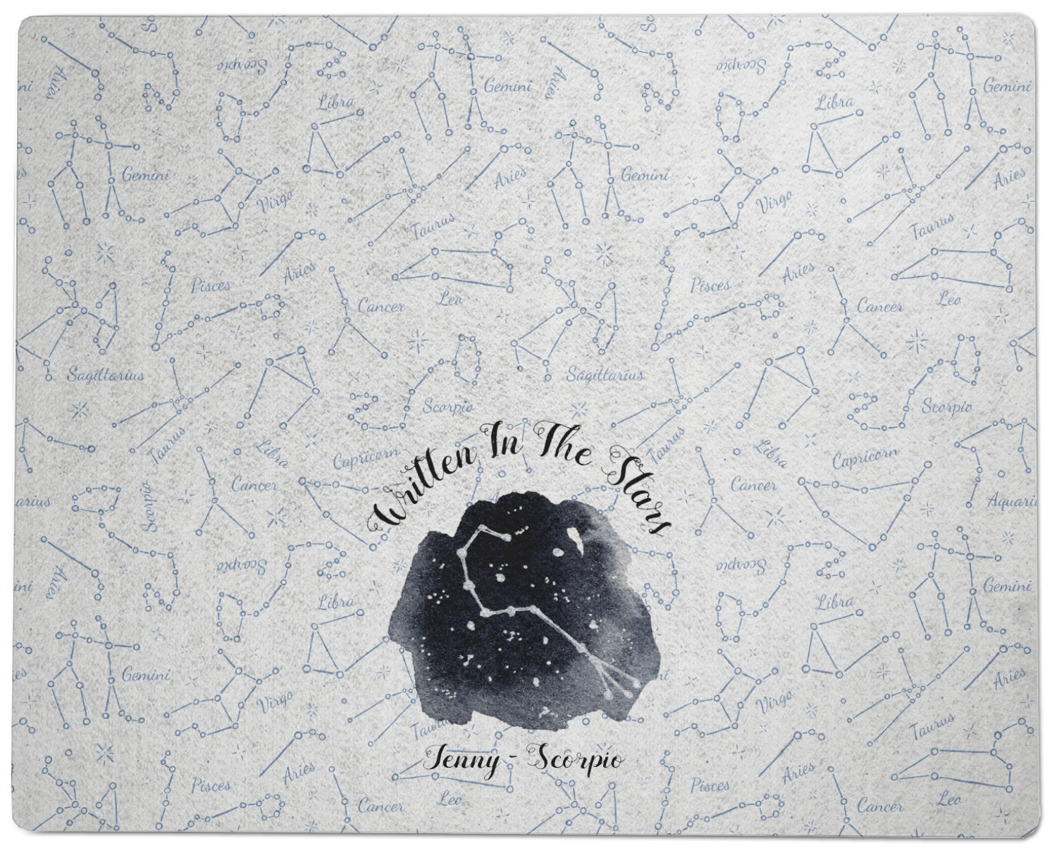 This design features a simplistic white and light blue background that has all of the zodiac constellations. The focal point of the design is your very own zodiac constellation surrounded by a sea of dark blue. It looks as if you are peeking into the night sky. Around this graphic is where you can put a phrase of your choosing and your personalization.