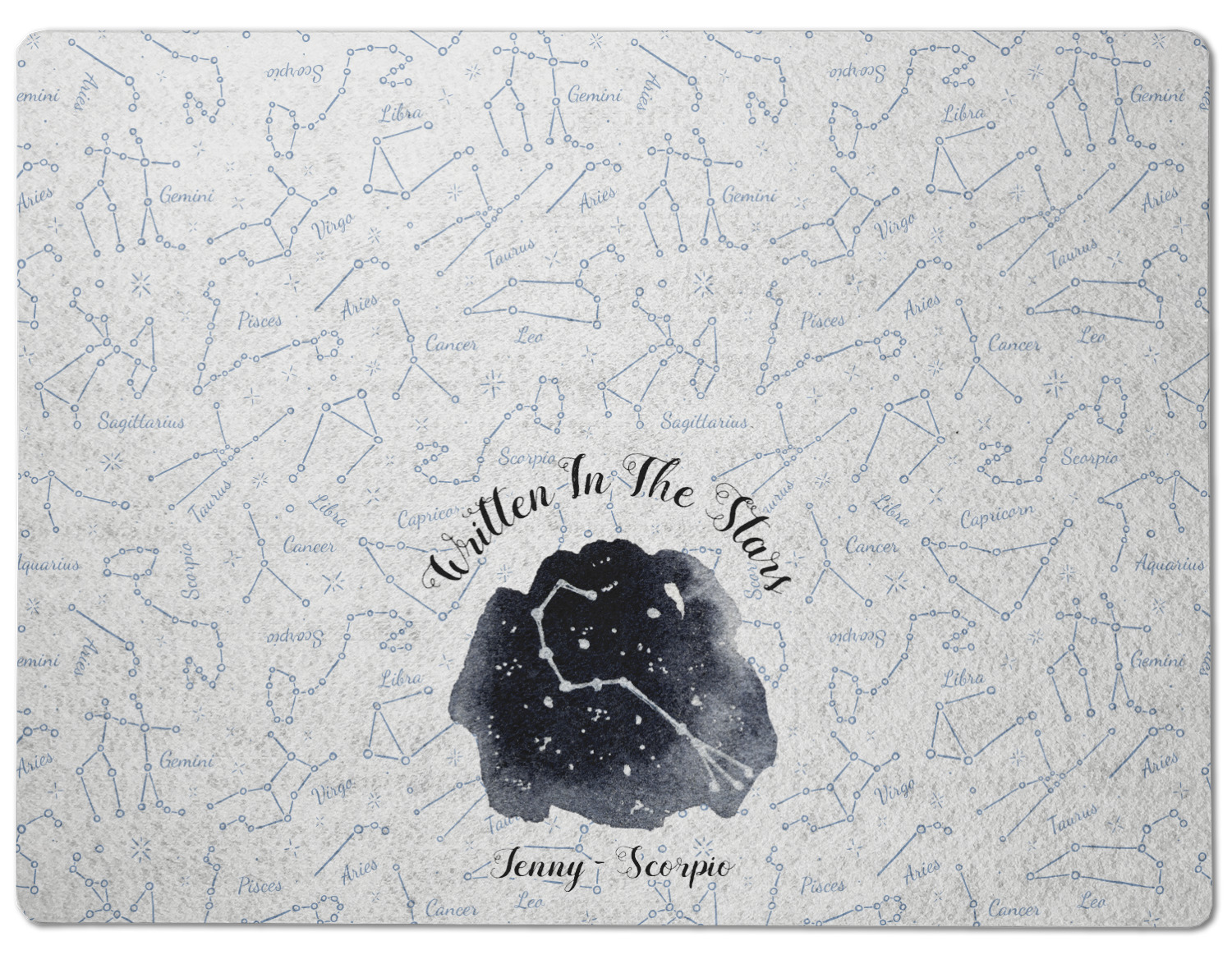 This design features a simplistic white and light blue background that has all of the zodiac constellations. The focal point of the design is your very own zodiac constellation surrounded by a sea of dark blue. It looks as if you are peeking into the night sky. Around this graphic is where you can put a phrase of your choosing and your personalization.
