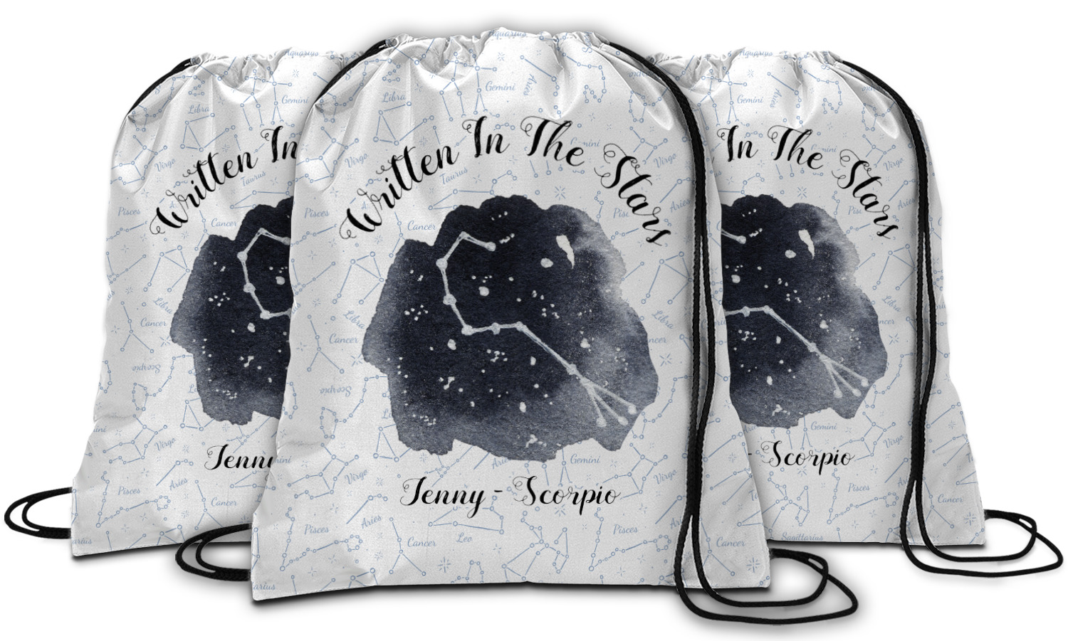 This design features a simplistic white and light blue background that has all of the zodiac constellations. The focal point of the design is your very own zodiac constellation surrounded by a sea of dark blue. It looks as if you are peeking into the night sky. Around this graphic is where you can put a phrase of your choosing and your personalization.
