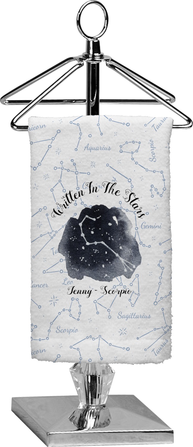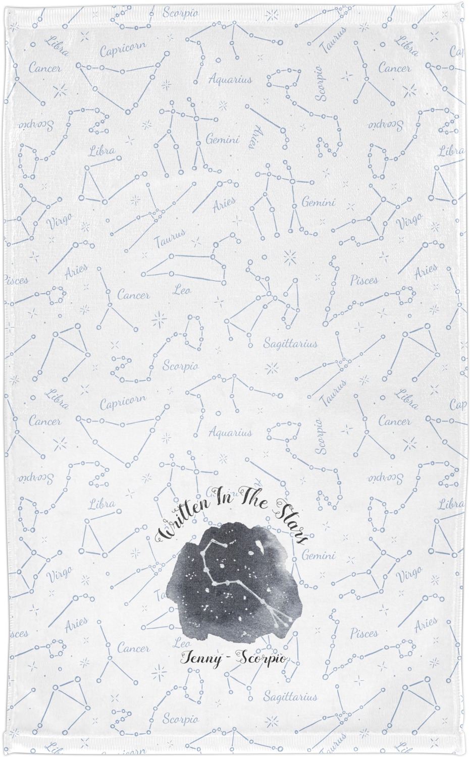 This design features a simplistic white and light blue background that has all of the zodiac constellations. The focal point of the design is your very own zodiac constellation surrounded by a sea of dark blue. It looks as if you are peeking into the night sky. Around this graphic is where you can put a phrase of your choosing and your personalization.