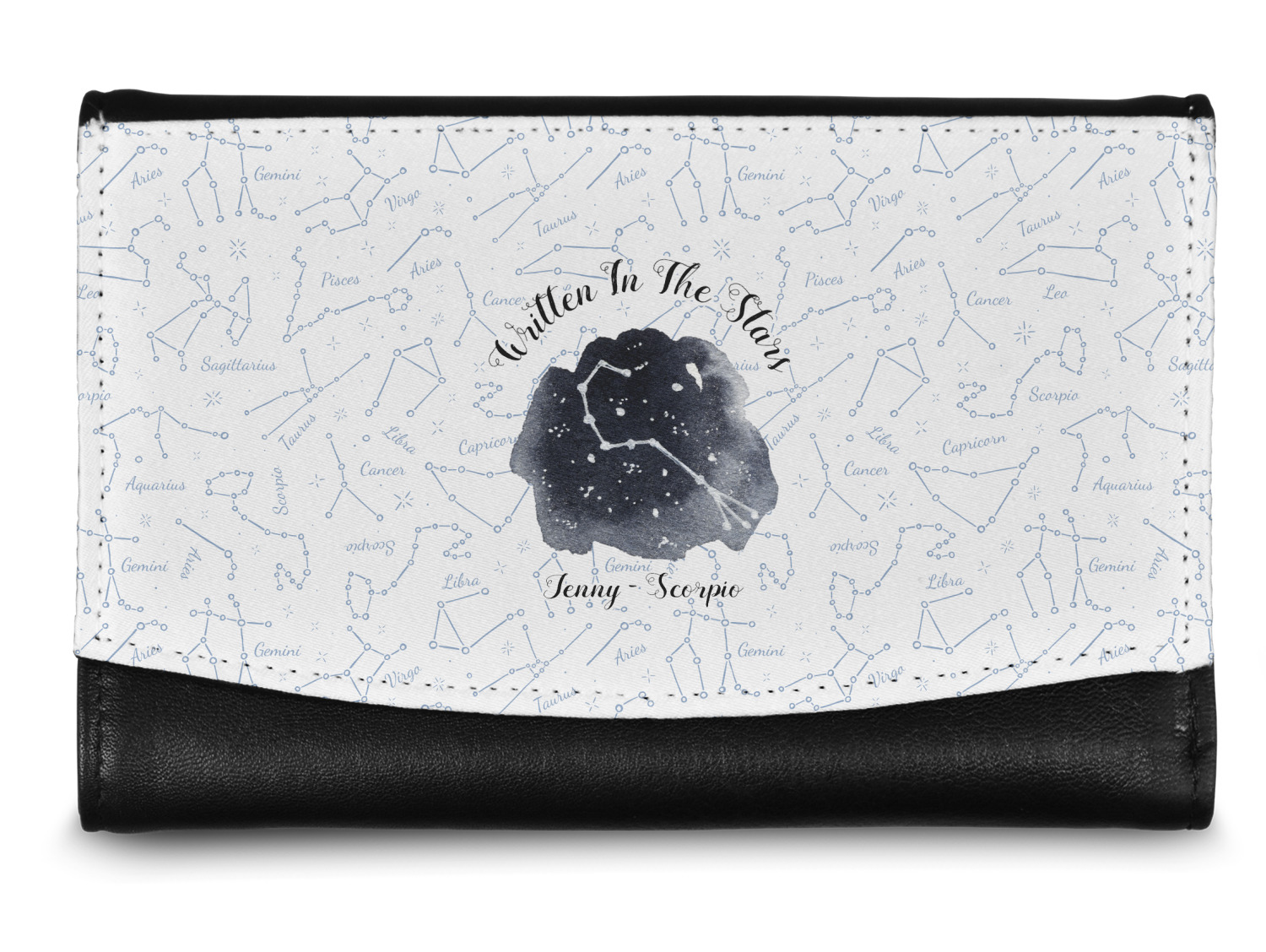 This design features a simplistic white and light blue background that has all of the zodiac constellations. The focal point of the design is your very own zodiac constellation surrounded by a sea of dark blue. It looks as if you are peeking into the night sky. Around this graphic is where you can put a phrase of your choosing and your personalization.