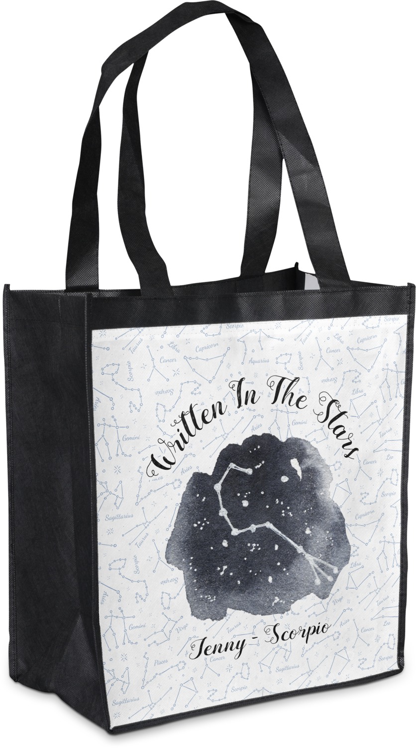 Made from a durable, biodegradable material, these reusable shopping bags can support up to 30 pounds of weight. With two large handles, measuring at 8.5 inches each, these personalized tote bags are easy to carry to your vehicle or home. The bag itself is 12 by 13.5 inches, and can expand to a depth of 7 inches. Your customization is printed on both the front and back, while the remaining sides, trim, and handle are a sleek, charcoal black.