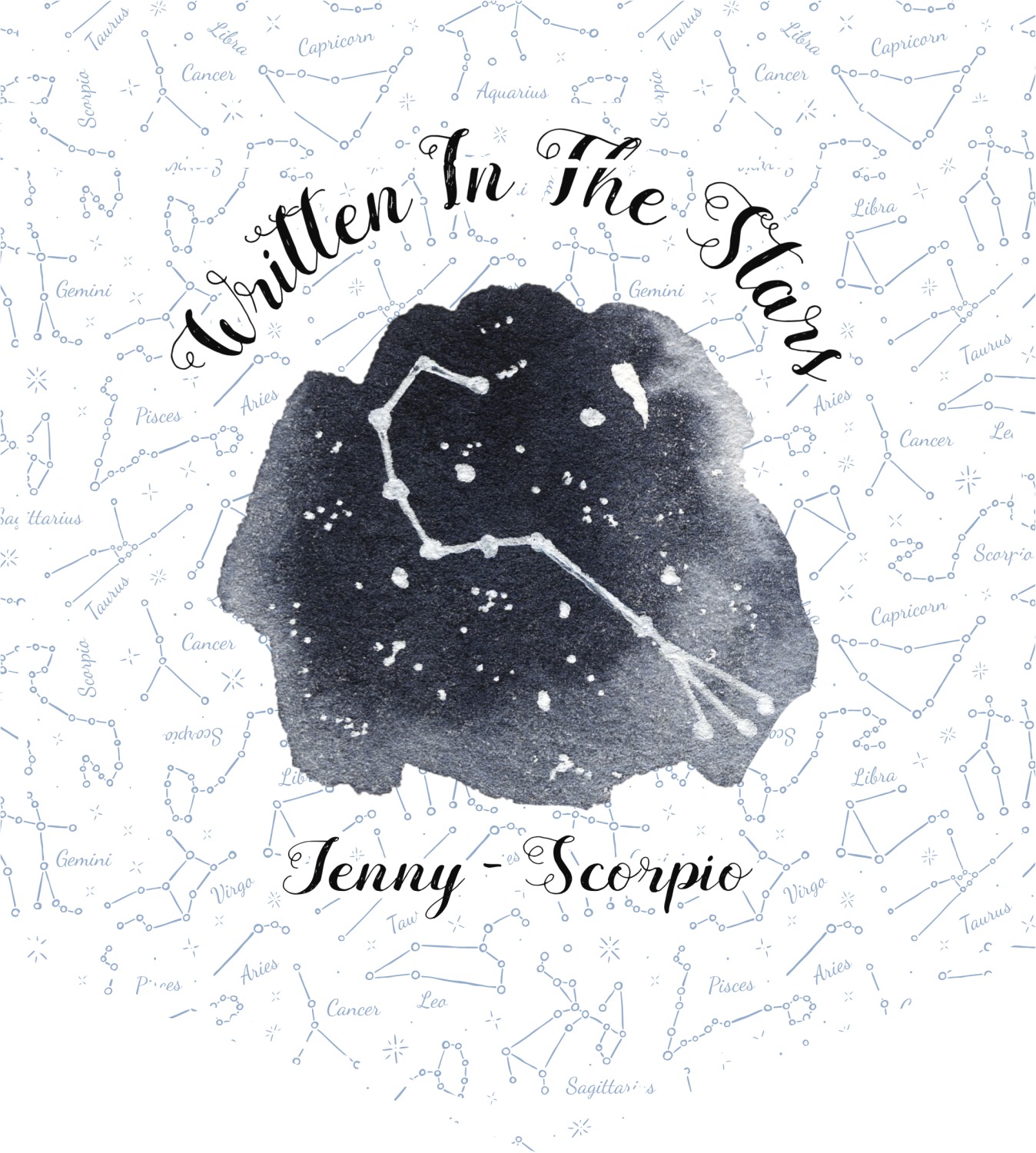 This design features a simplistic white and light blue background that has all of the zodiac constellations. The focal point of the design is your very own zodiac constellation surrounded by a sea of dark blue. It looks as if you are peeking into the night sky. Around this graphic is where you can put a phrase of your choosing and your personalization.
