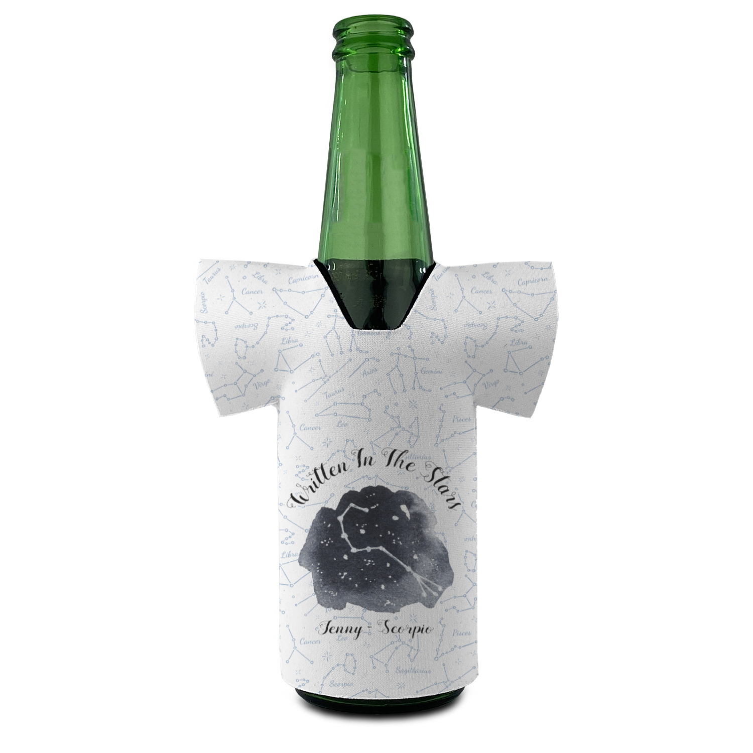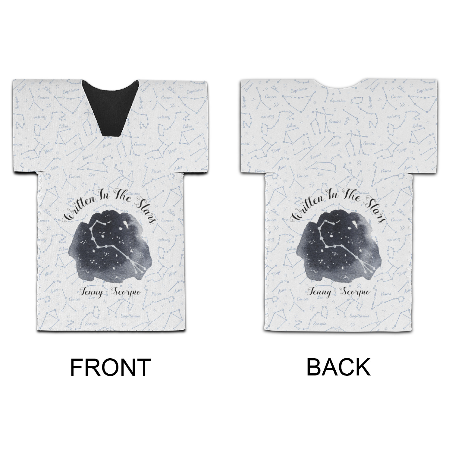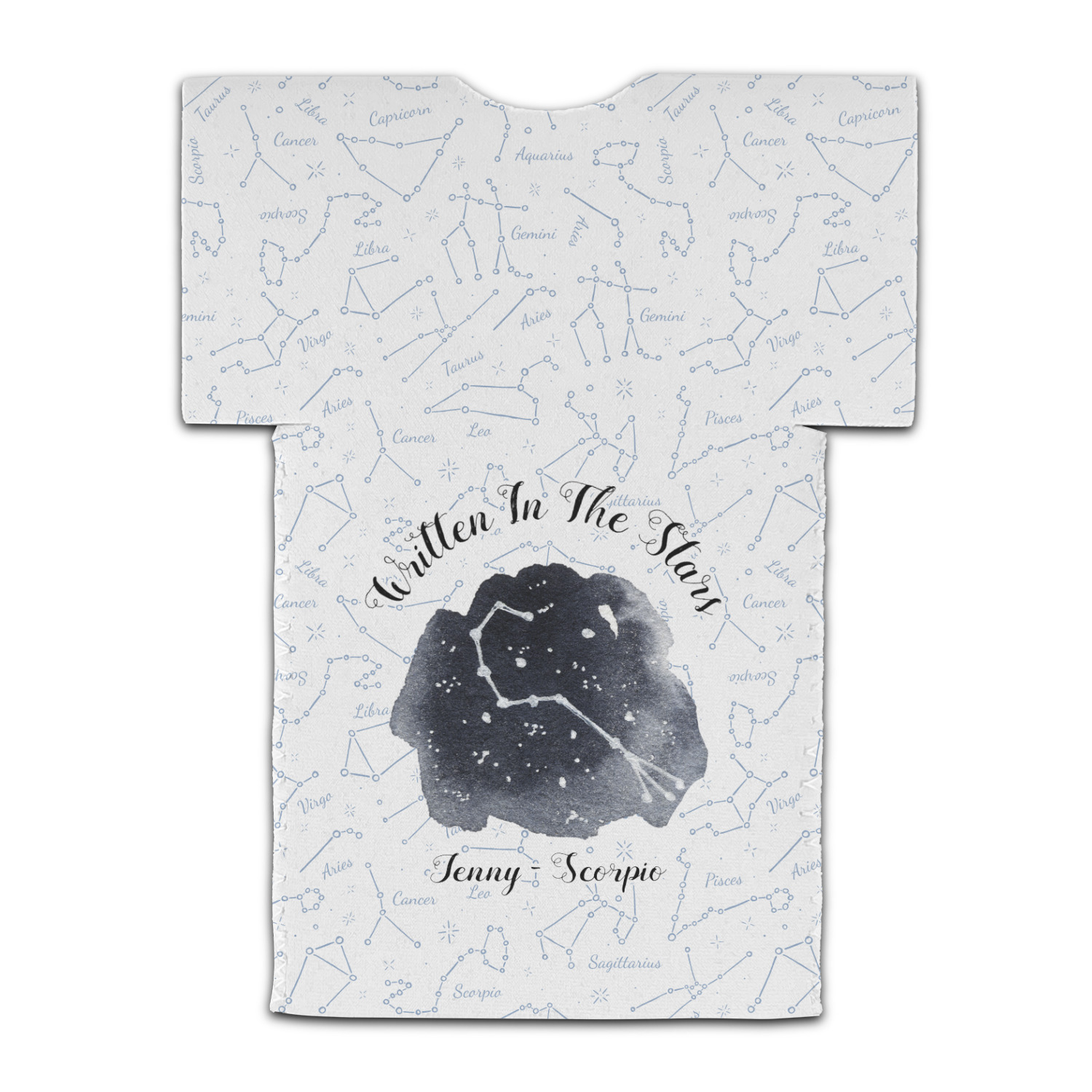 This design features a simplistic white and light blue background that has all of the zodiac constellations. The focal point of the design is your very own zodiac constellation surrounded by a sea of dark blue. It looks as if you are peeking into the night sky. Around this graphic is where you can put a phrase of your choosing and your personalization.