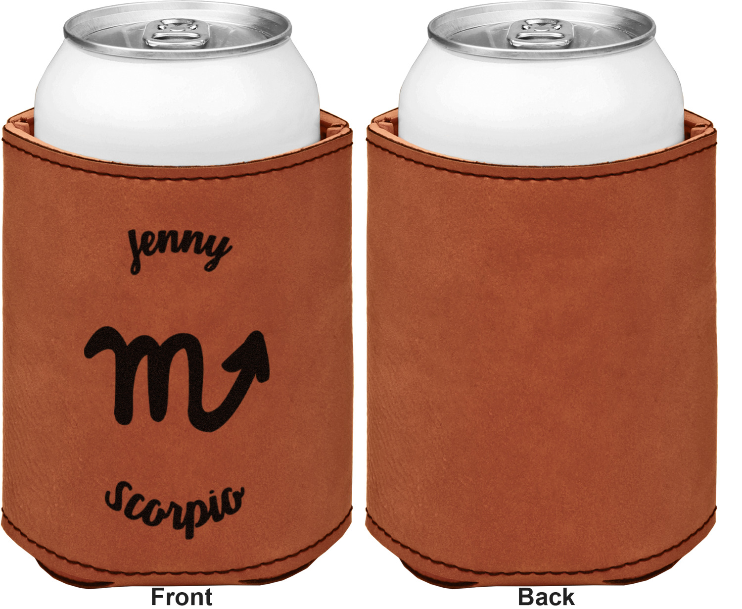 This can sleeve is made from a cognac-brown leatherette and stitched with a sturdy, black thread. A slim padding lines the inside of your can sleeve to allow for a better fit once your drink is inserted. The sleeve itself measures at 4 by 4.5 inches, allowing this custom can sleeve to accommodate most canned drinks. Your personalized design can be engraved on the front and back, or solely the front. When laser-engraved, your design appears as a black coloration which contrasts the leatherette nicely.