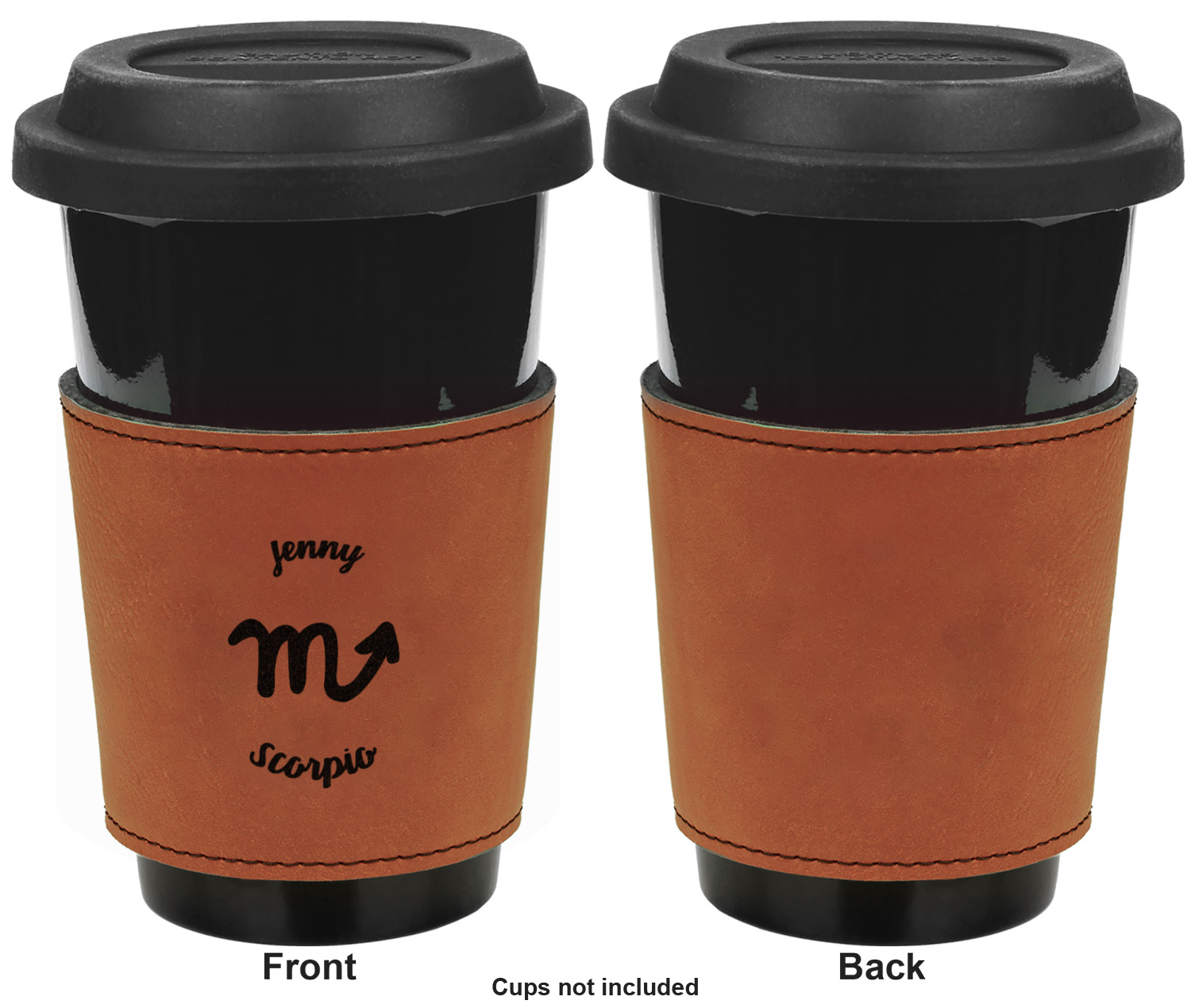 This cup sleeve is made from a suave, cognac-brown leatherette and finished with an intricate, black stitch. The interior of this can sleeve is fabricated from a thin foam material to help insulate your mug's contents. The sleeve is specifically made to suit tapered glasses or mugs, so the top's diameter is 3.5 inches, while the bottom's diameter is 2.75 inches. Your customized design will be laser engraved into the leatherette, leaving behind crisp, black imprint. With these products, we provide you with the option of engraving the front and back, or the front only.