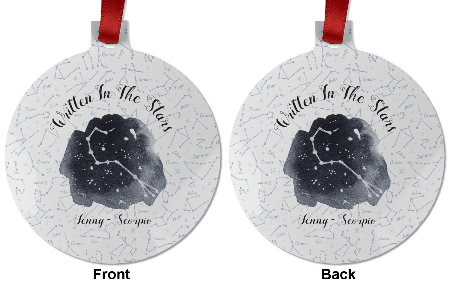 This design features a simplistic white and light blue background that has all of the zodiac constellations. The focal point of the design is your very own zodiac constellation surrounded by a sea of dark blue. It looks as if you are peeking into the night sky. Around this graphic is where you can put a phrase of your choosing and your personalization.