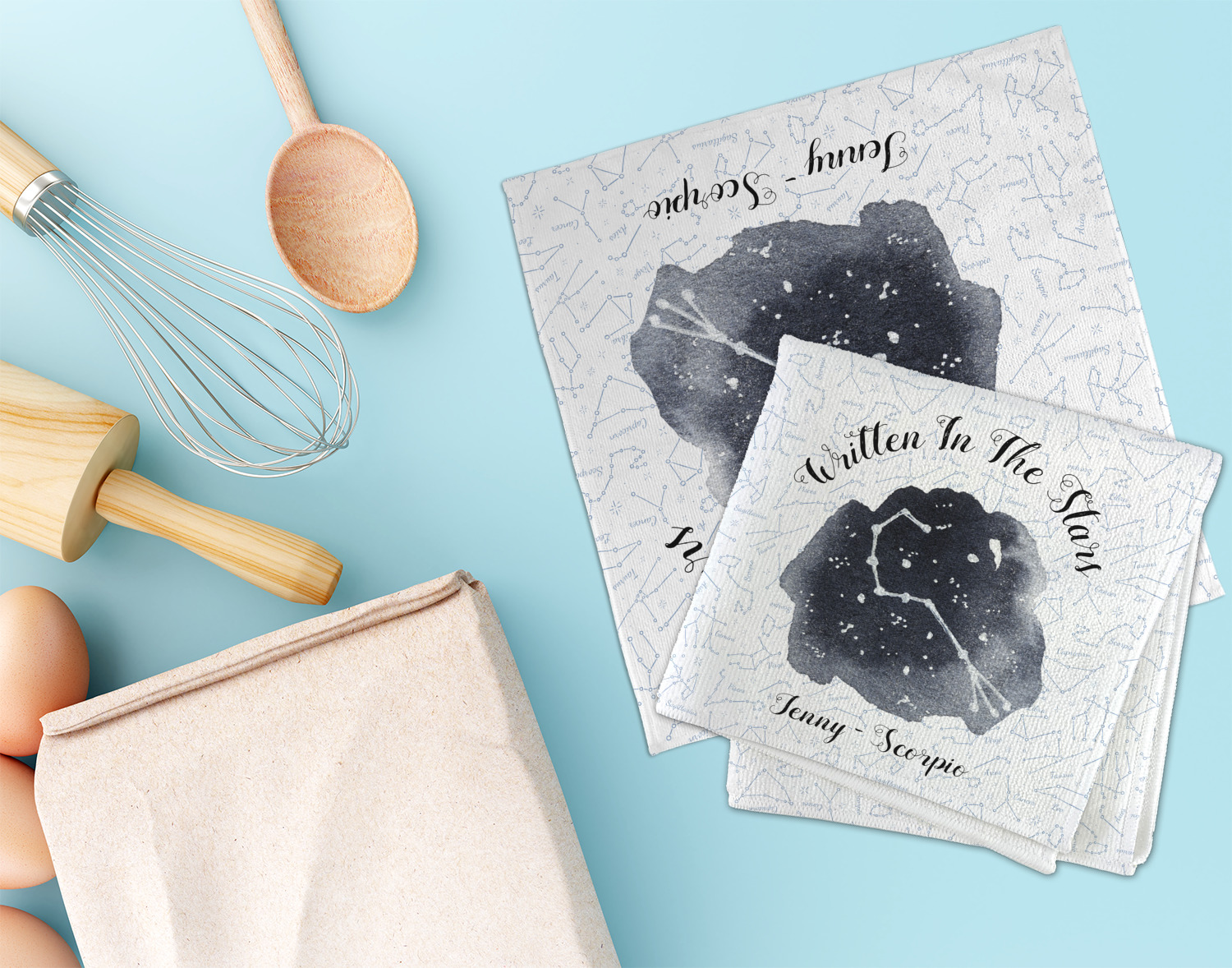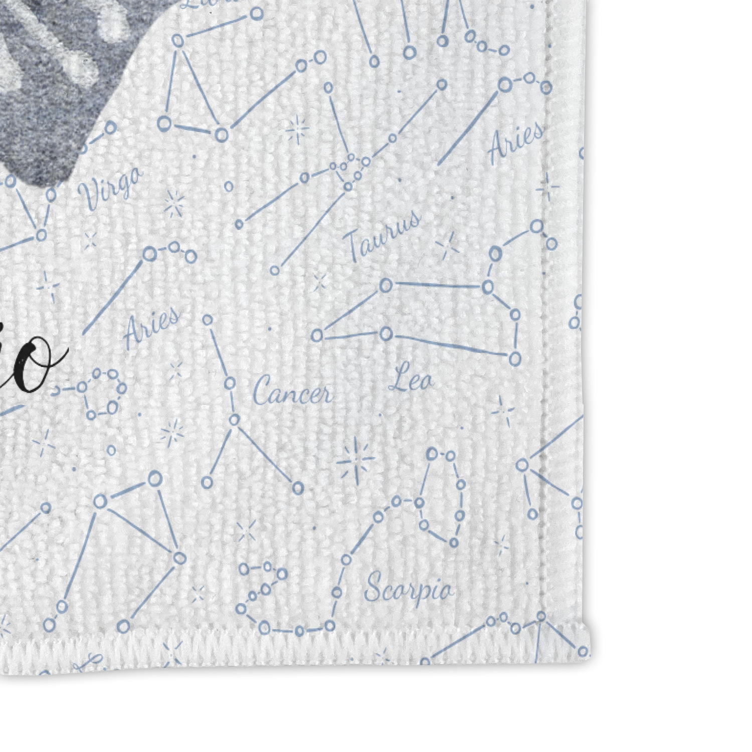 This design features a simplistic white and light blue background that has all of the zodiac constellations. The focal point of the design is your very own zodiac constellation surrounded by a sea of dark blue. It looks as if you are peeking into the night sky. Around this graphic is where you can put a phrase of your choosing and your personalization.