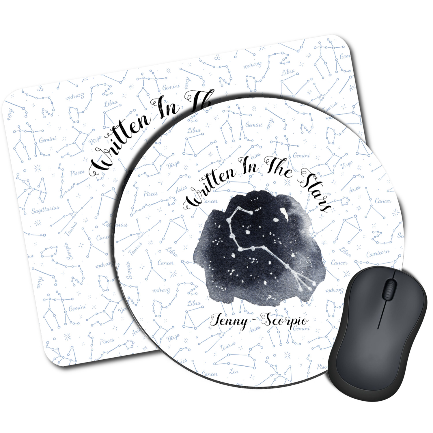 This design features a simplistic white and light blue background that has all of the zodiac constellations. The focal point of the design is your very own zodiac constellation surrounded by a sea of dark blue. It looks as if you are peeking into the night sky. Around this graphic is where you can put a phrase of your choosing and your personalization.