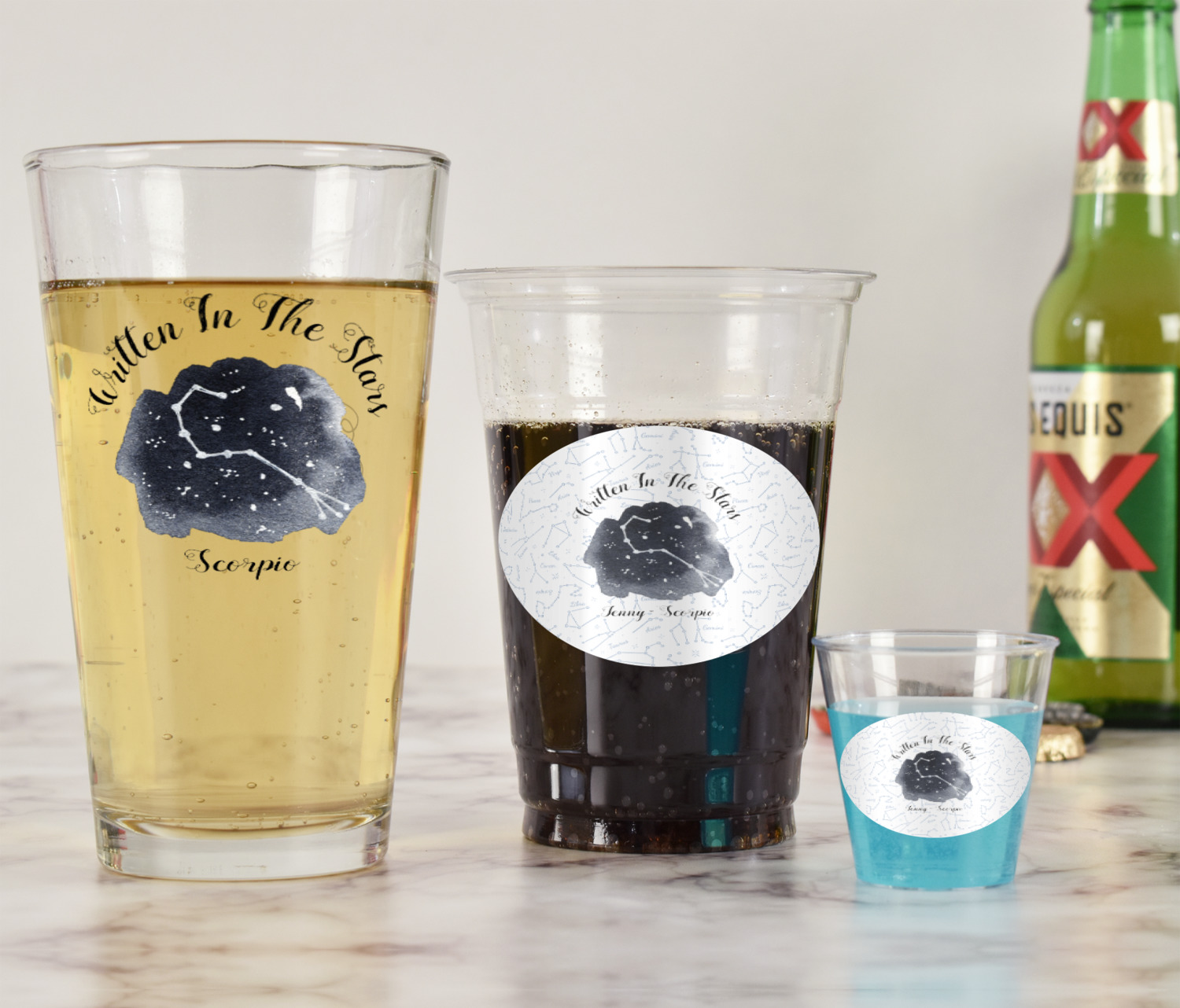 This design features a simplistic white and light blue background that has all of the zodiac constellations. The focal point of the design is your very own zodiac constellation surrounded by a sea of dark blue. It looks as if you are peeking into the night sky. Around this graphic is where you can put a phrase of your choosing and your personalization.