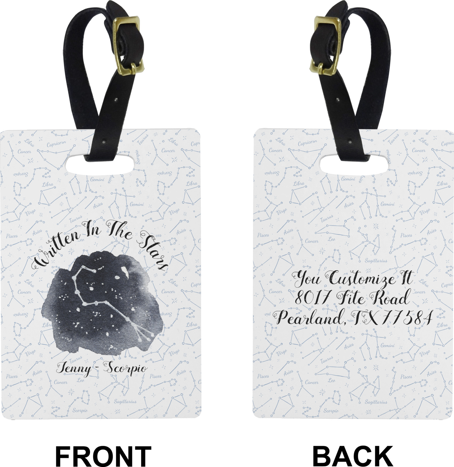 These cute luggage tags are made of a fiber-reinforced, UV-resistant plastic, making them waterproof and durable enough for both everyday use and the rugged adventures of any traveler! A leather strap with holes and a buckle is included with your purchase and can be used to attach your custom luggage tag to any suitcase, backpack, or duffel bag. You can design these travel tags as you wish; your customization will be displayed across the front, while the back will show as little or as much personal information as you want.