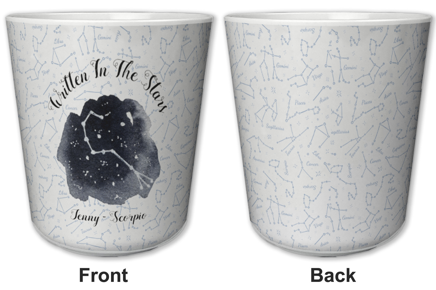 This design features a simplistic white and light blue background that has all of the zodiac constellations. The focal point of the design is your very own zodiac constellation surrounded by a sea of dark blue. It looks as if you are peeking into the night sky. Around this graphic is where you can put a phrase of your choosing and your personalization.