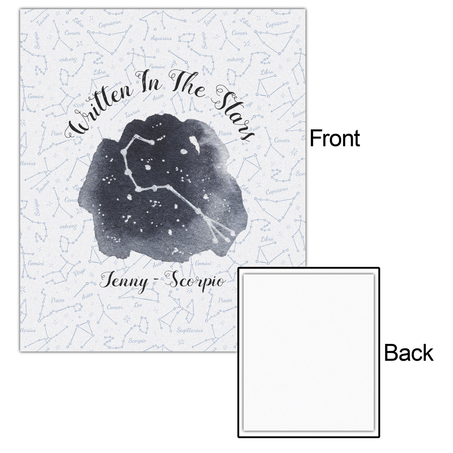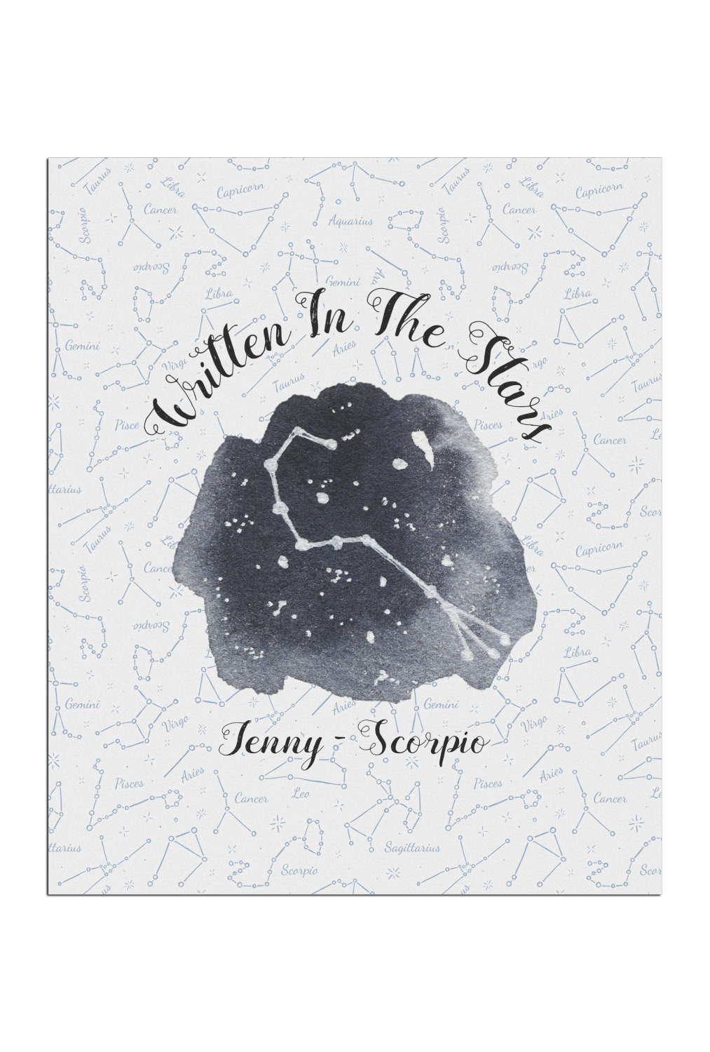 This design features a simplistic white and light blue background that has all of the zodiac constellations. The focal point of the design is your very own zodiac constellation surrounded by a sea of dark blue. It looks as if you are peeking into the night sky. Around this graphic is where you can put a phrase of your choosing and your personalization.