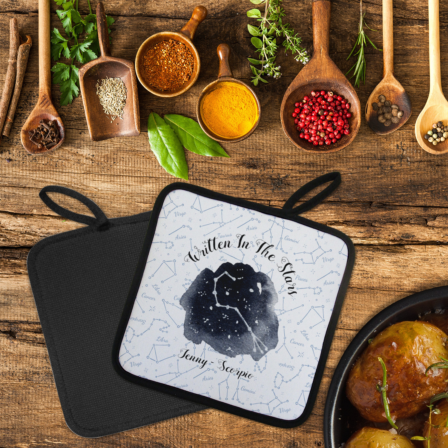 Our personalized pot holders feature a neoprene front that displays your personalization in vibrant colors. The backing of the hot pot holder is rubberized; the textured backing allows you to have a great grip when using this custom pot holder. The two materials are joined with a sleek, black trim, and the holder also includes an attached loop for hanging and storage. The pot holder is approximately 8.75 inches by 8.75 inches and 0.25 inches tall, while the fabric loop is 2.5 inches long. You can purchase a kitchen pot holder by itself or as a set of 2. We also offer a set including one pot holder and one oven mitt.