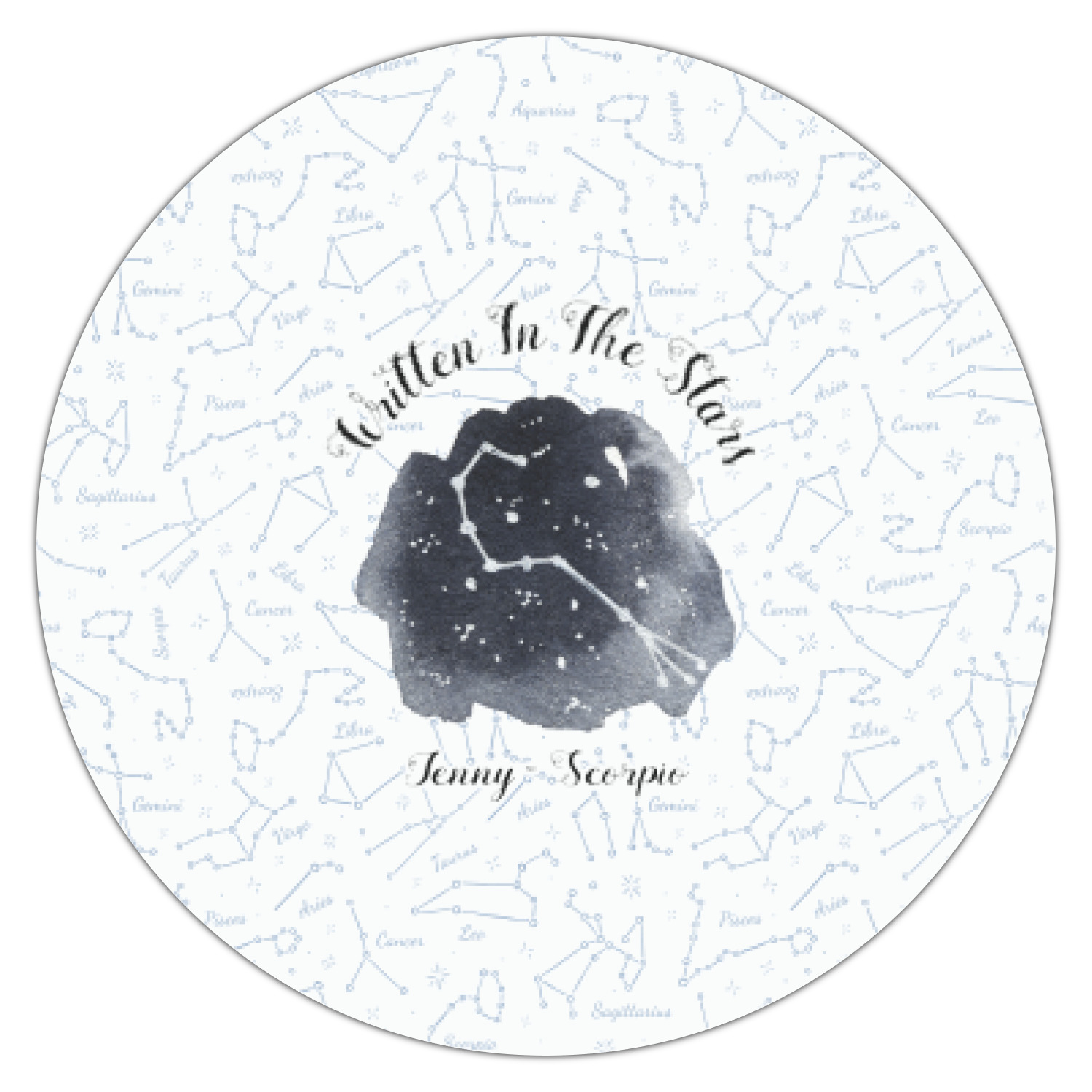 This design features a simplistic white and light blue background that has all of the zodiac constellations. The focal point of the design is your very own zodiac constellation surrounded by a sea of dark blue. It looks as if you are peeking into the night sky. Around this graphic is where you can put a phrase of your choosing and your personalization.