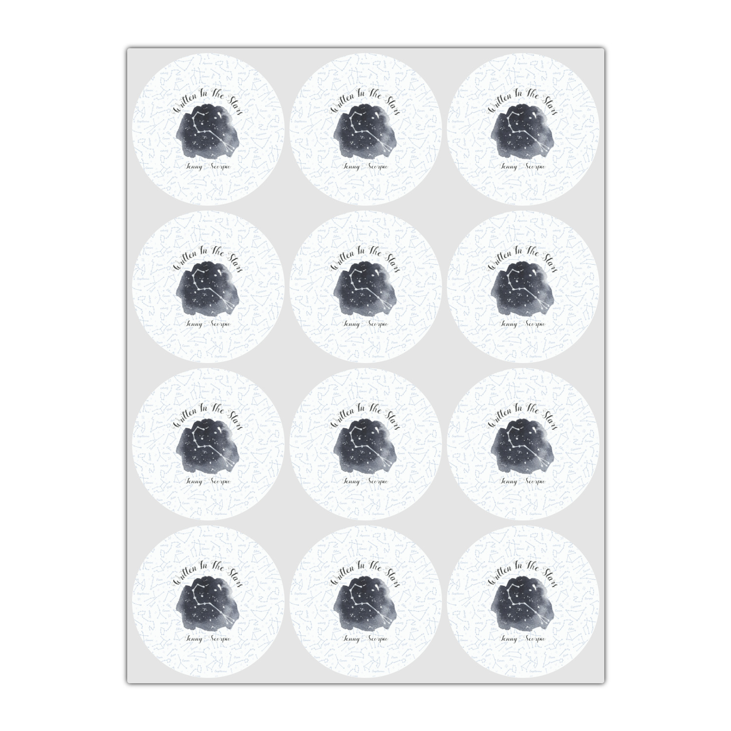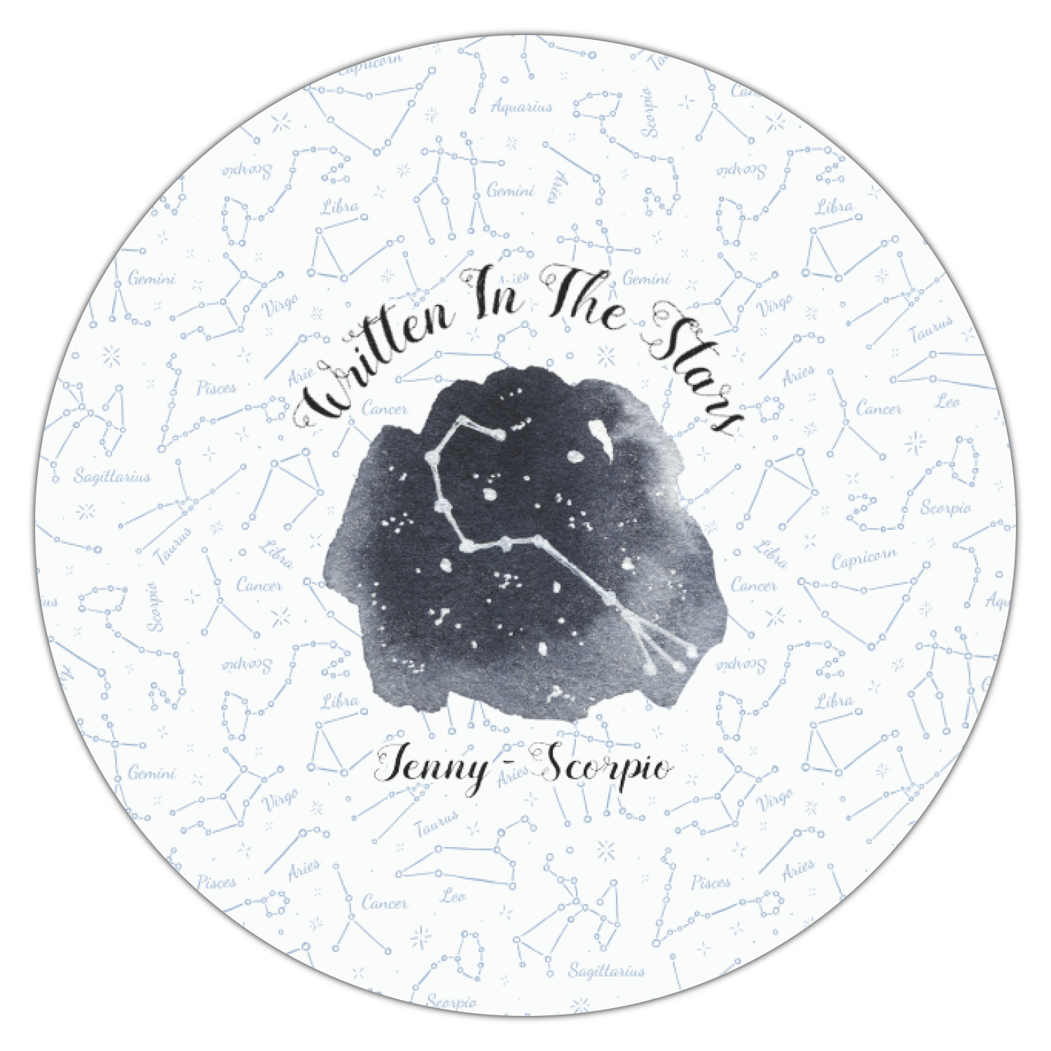 This design features a simplistic white and light blue background that has all of the zodiac constellations. The focal point of the design is your very own zodiac constellation surrounded by a sea of dark blue. It looks as if you are peeking into the night sky. Around this graphic is where you can put a phrase of your choosing and your personalization.