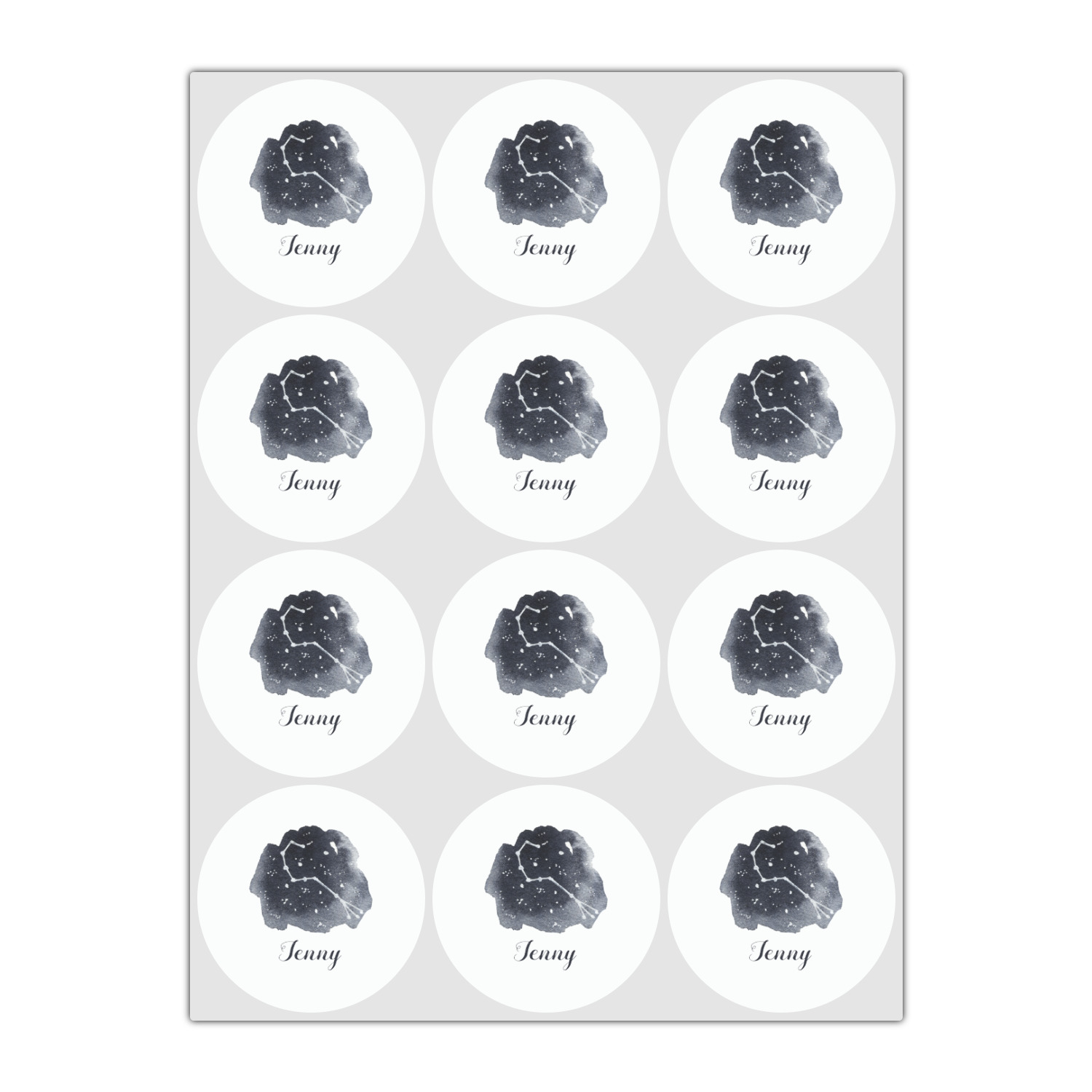 This design features a simplistic white and light blue background that has all of the zodiac constellations. The focal point of the design is your very own zodiac constellation surrounded by a sea of dark blue. It looks as if you are peeking into the night sky. Around this graphic is where you can put a phrase of your choosing and your personalization.