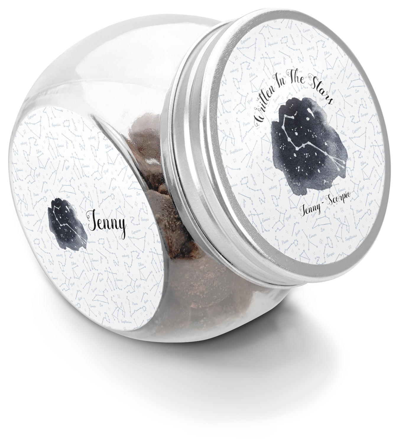 This treat jar is an excellent way to store treats for your favorite canine or feline. Moreover, their delicate, classy appearance makes them a tasteful addition to your countertop's décor. Crafted from clear glass, its unique construction and silver metal, screw-on lid allows for quick and easy access. Three, permanent, vinyl stickers are applied to both sides of the jar and lid, presenting your personalized design. The base of this glass, dog treat jar is 3.4" x 4.75", and the jar stands at 5" tall. Though on the smaller side, this jar is best suited for smaller treats or training treats.